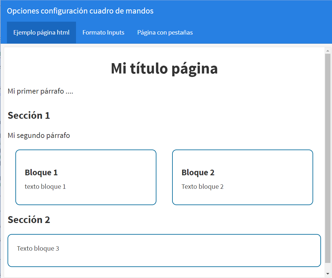 Existen múltiples opciones de configuración para la salida de un cuadro de mandos. Para ilustrar algunas de ellas vamos a usar el cuadro de mandos de ejemplo Dashboard4.Rmd. Este cuadro de mandos tiene un menú en la parte superior para acceder a 3 páginas. En la primera página vemos un ejemplo de renderizado de código html: