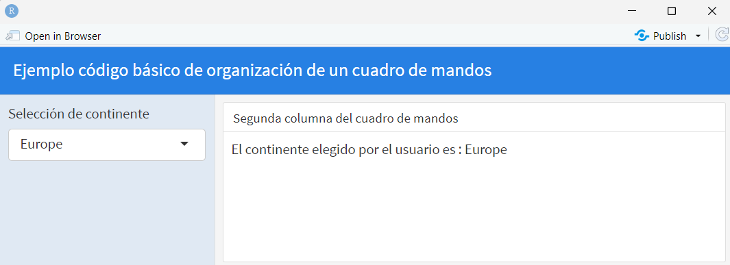 Para tener una primera idea de como funciona un cuadro de mandos dinámico vamos a presentar un primer ejemplo de cuadro de mandos organizado en 2 columnas. En la primera columna ponemos un menú desplegable para que el usuario elija un continente. En la segunda columna, simplemente imprimimos la selección realizada por el usuario. Un imagen estática de la salida de este cuadro de mandos sería la siguiente (para obtener la versión dinámica copiar el código que figura debajo en un fichero Rmd y ejecutar Run document en el menú superior (opción que reemplaza al knit en este tipo de ficheros Rmd)):