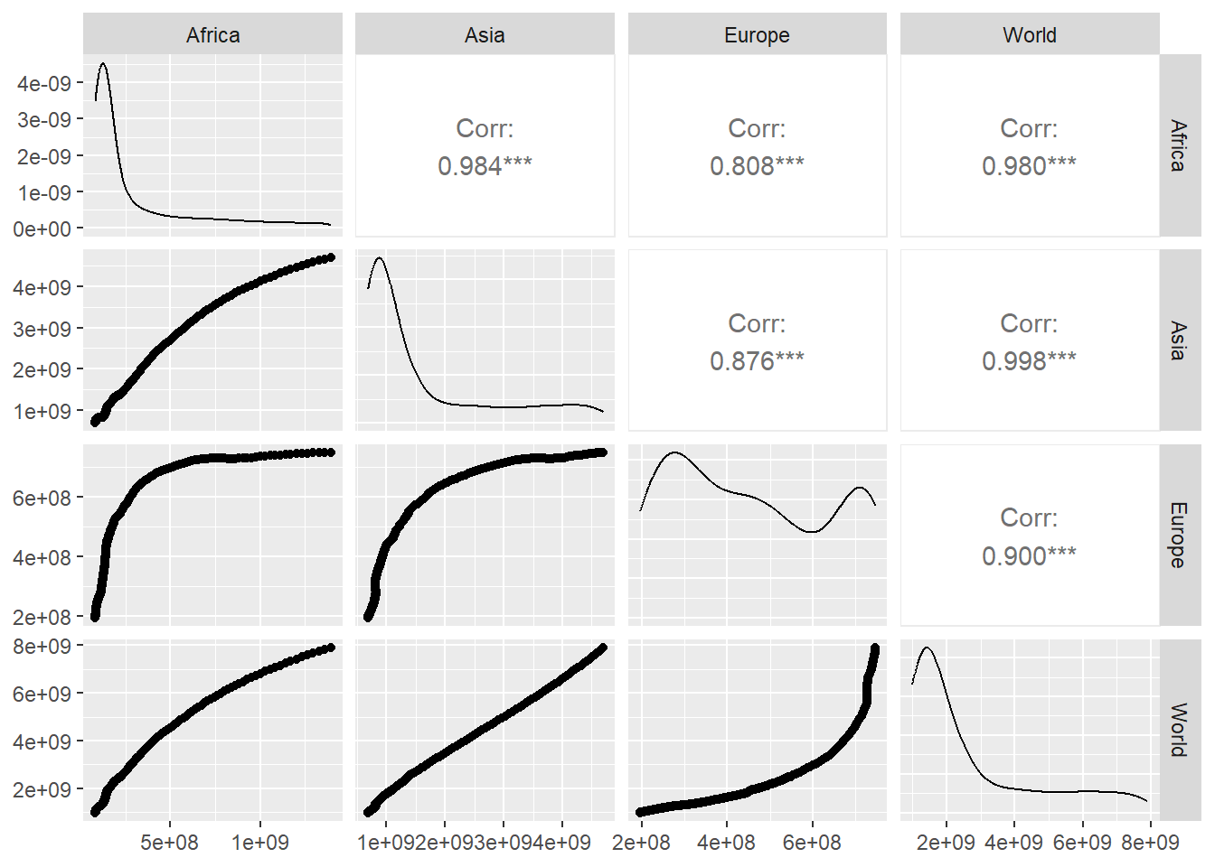 We can also compare the time series between them. The following table with graphs, built using the pivot_wider and ggpairs function of the GGally library, shows, on the diagonal, the density function of the distribution of values, at the bottom the scatterplot of each pair of time series and at the top the value of the correlation between each pair of time series, the closer that value is to 1, the better the combined values of each fit the regression line. We can observe that the evolution of the population in Europe has a different behavior than in the other regions, which produces a lower value of the correlation when comparing Europe with the other regions.