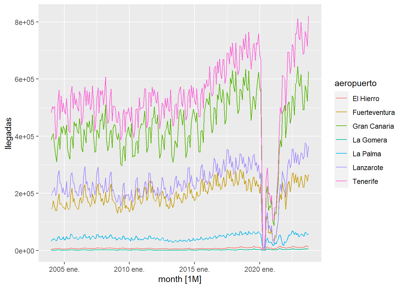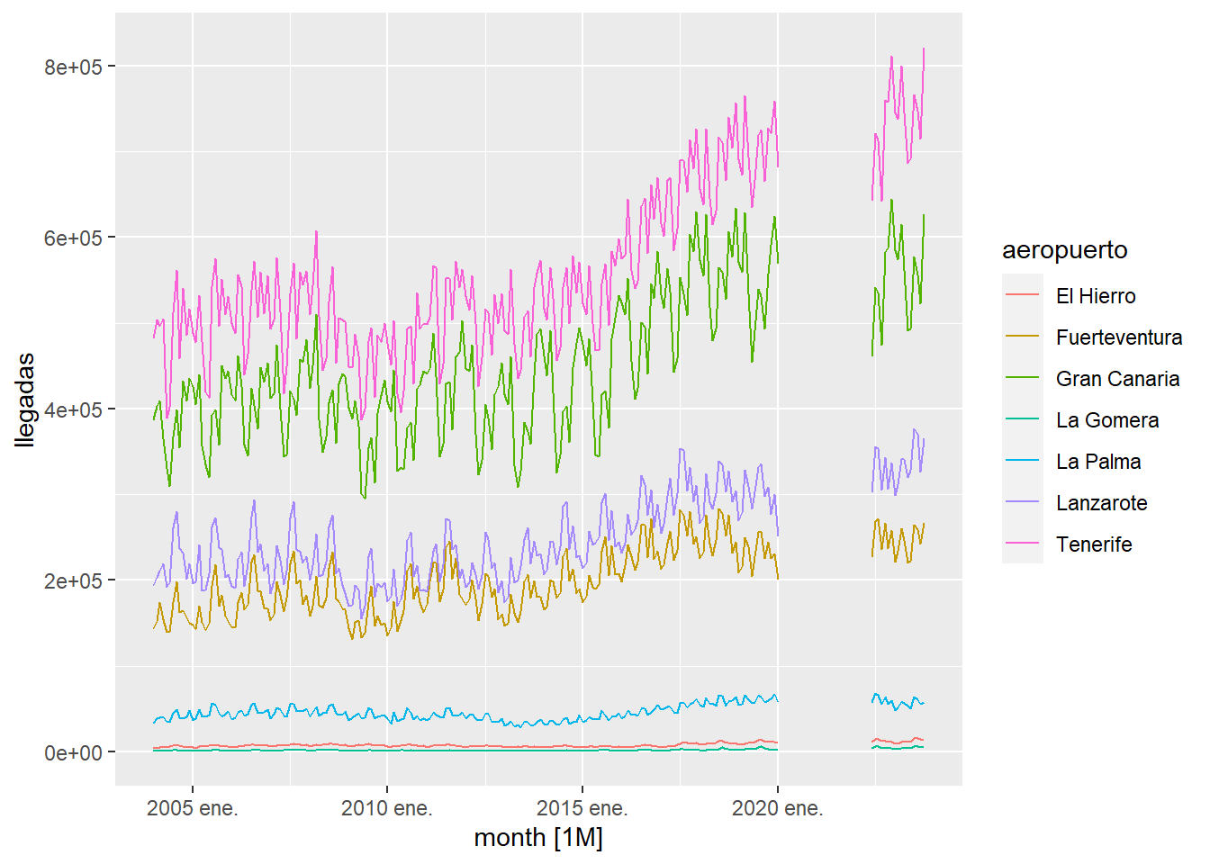Sometimes, there are gaps in the time series, that is, data is missing on intermediate dates or there is anomalous data, such as the monthly arrival of travelers at the Canarian airports during the period of the pandemic caused by COVID-19. To study this issue we are going to use data obtained from a query to ISTAC: