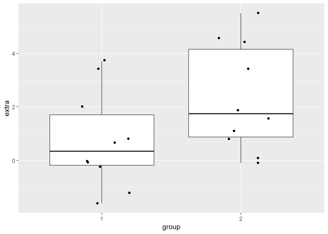 A boxplot can be helpful to identify if there are outliers in our groups. We will make a boxplot, again using ggplot2. In the code below, we are first defining our data (data = df) and x (x = group) and y (y = extra) values. Our x value is our grouping variable, and our y value is the one we are comparing; in our case, how many extra hours of sleep. The next line calls the boxplot function (geom_boxplot()), and the last one prints each data point as a dot on the box plot (geom_jitter()). The last argument can be left blank, but it may be easier to compare sparse data points when they’re not as spread out horizontally, so the width = .2 argument squishes them together a bit. The opposite is true with larger datasets - you may want them more spread out! In which case, you can leave that argument blank.