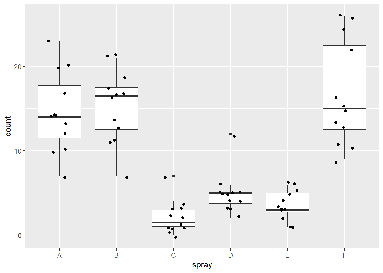 We can also use a box plot to examine our data, and look for outliers in each of the groups. To do this, we will use ggplot2 to create boxplots by group. First, we define our data (data = bugs), x (x = spray), and y (y = count) values. The x value is our grouping variable, and our y value is the one we are comparing. The next line is the boxplot function (geom_boxplot()), and the last line prints each data point as a dot on the box plot (geom_jitter()).
