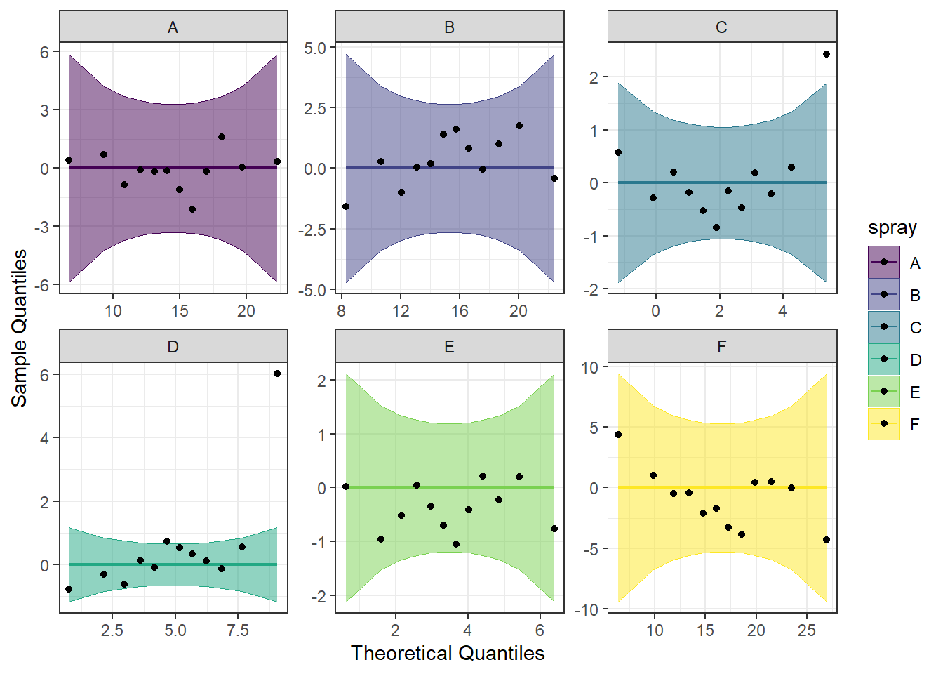 5. facet_wrap(~ spray, scales = "free") + is a similar argument to the bar plot above. This is sorting by group (~ spray), and creating a qq plot for each of our sprays. The scales = "free" refers to the scales of the axes; by setting them to “free” we are allowing them to freely vary between each of the graphs. If you want the scale to be fixed, you would use scale = "fixed".