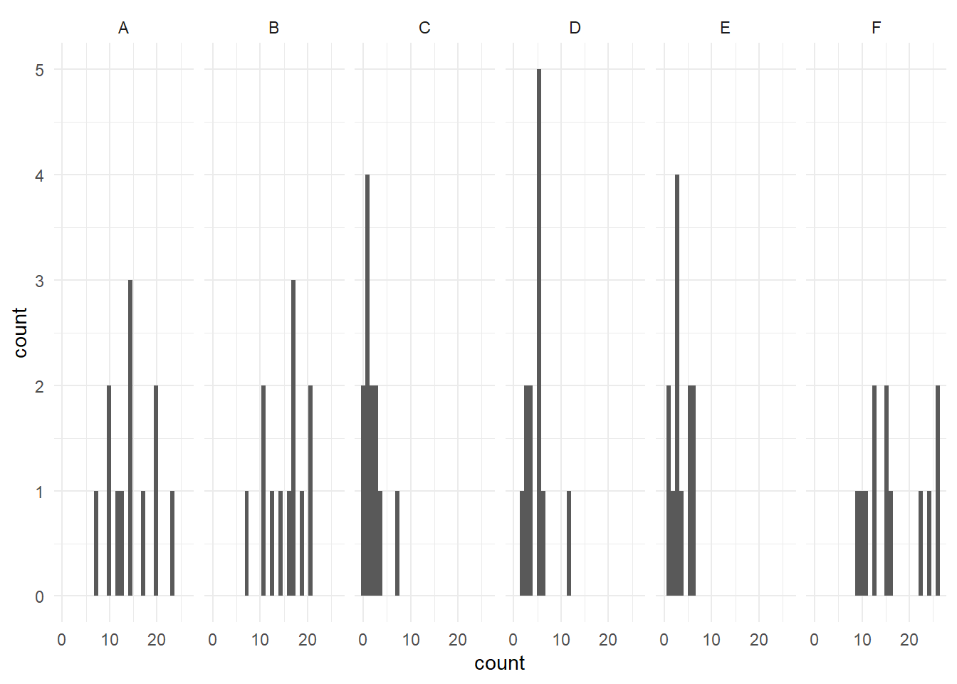 "p-value" = shapiro.test(count)$p.value)## # A tibble: 6 × 3