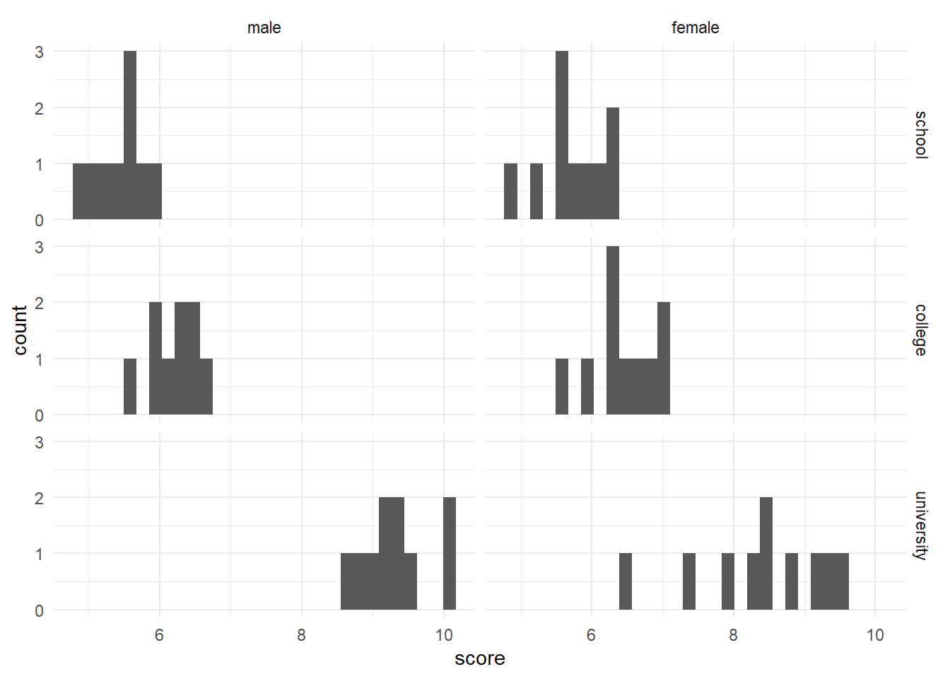 We will use a stacked histogram, by adding the function facet_grid(education_level ~ gender) to our ggplot object. This will generate one histogram per combination, in a grid layout rather than a truly “stacked” layout. This phrasing (education_level ~ gender) is saying put the different education levels on the “y axis” of the grid, and different gender options along the “x axis” of the grid. If you’d like the grid to be inverted, with education level across the top and gender along the side, you would use gender ~ education_level. At the end, theme_minimal() is addressing how the graphs look - getting rid of the grey background, for example.