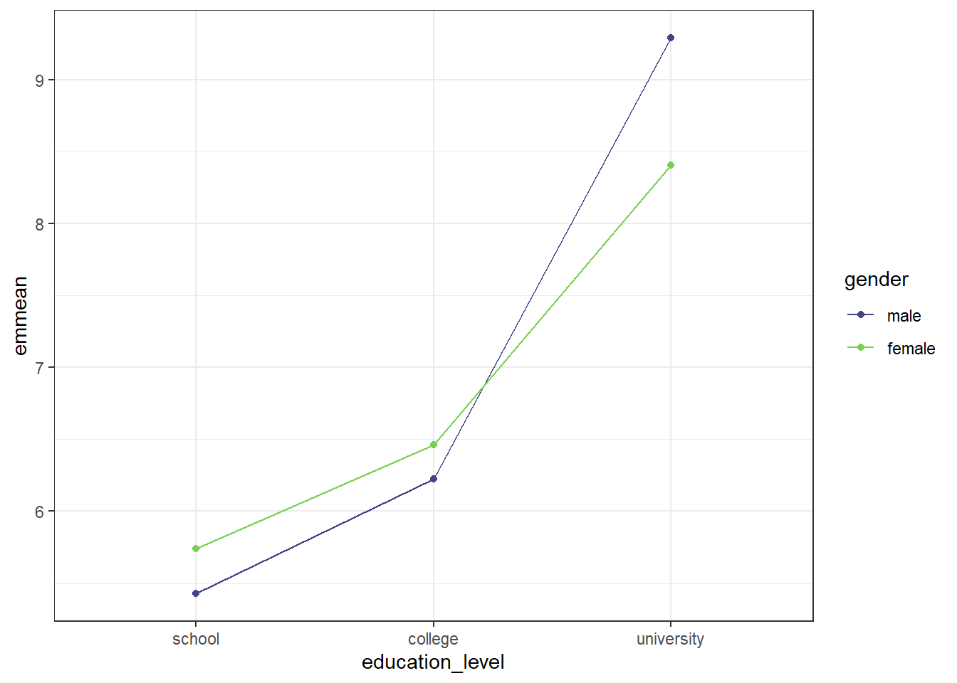 As expected, there is no significant difference between male and female (there was no significant main effect). However, looking at the marginal comparisons for the main effect of education level, we can see that there are significant differences between all levels. Looking at the output from emmeans, we can say that the job satisfaction scores averaged across gender were 0.76 units lower for an educational level of school as compared to an educational level of college.