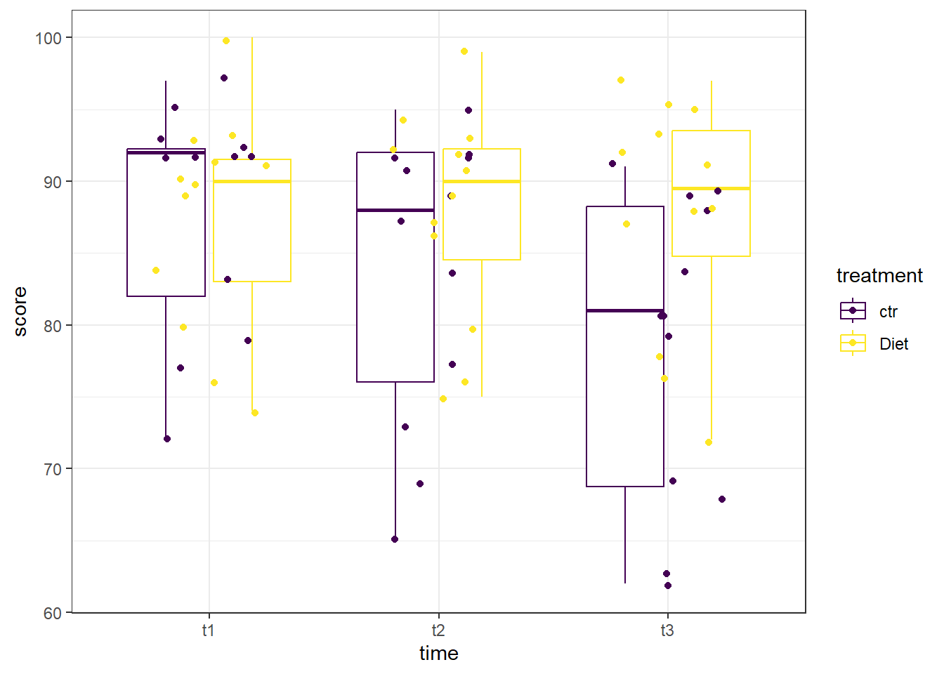 A boxplot can be helpful to identify if there are outliers in any of the combinations. We will make a boxplot using ggplot2 and using viridis for our color scale. In the code below, we first define our data (data = se2_long) and x (x = time) and y (y = score) values. Our x value is our grouping variable (time) that we want on the x-axis, and our y value is the one we are comparing (scores). The next line calls the boxplot function (geom_boxplot()). We added the argument aes(color = treatment) to allow different colors per treatment group. geom_jitter() prints each data point as a dot on the box plot, and the argument aes(color = treatment) again color-codes the dots by treatment. The next line, scale_color_viridis(discrete = TRUE) assigns the viridis color scale to the colors in the plot, which is a colorblind friendly scale. discrete = TRUE is used because we are not using all continuous variables (recall we changed time to a factor). The last line is a theme line, and addresses plot background color and such.