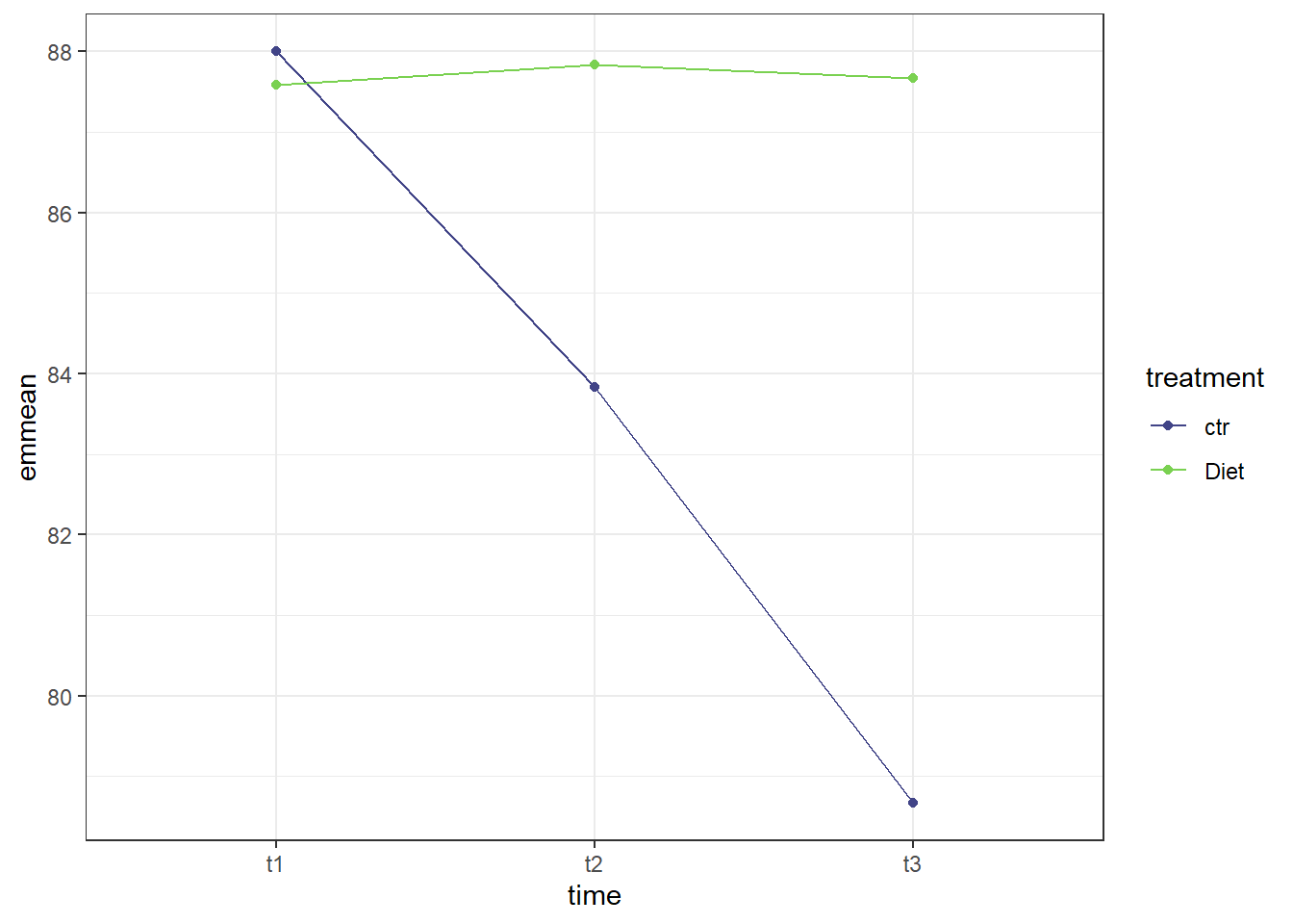 1. ggplot() is the main function, and gets fed what the data is (data = as.data.frame(model_se2_time_treatment)). You may notice the extra wrapper around our data this time, the as.data.frame(). This is because the estimated means table from the emmeans() function is not a dataframe, and ggplot only takes dataframes. This wrapper changes the object into a dataframe. The other argument on this line is defining our x and y values (aes(x = time, y = emmean)).