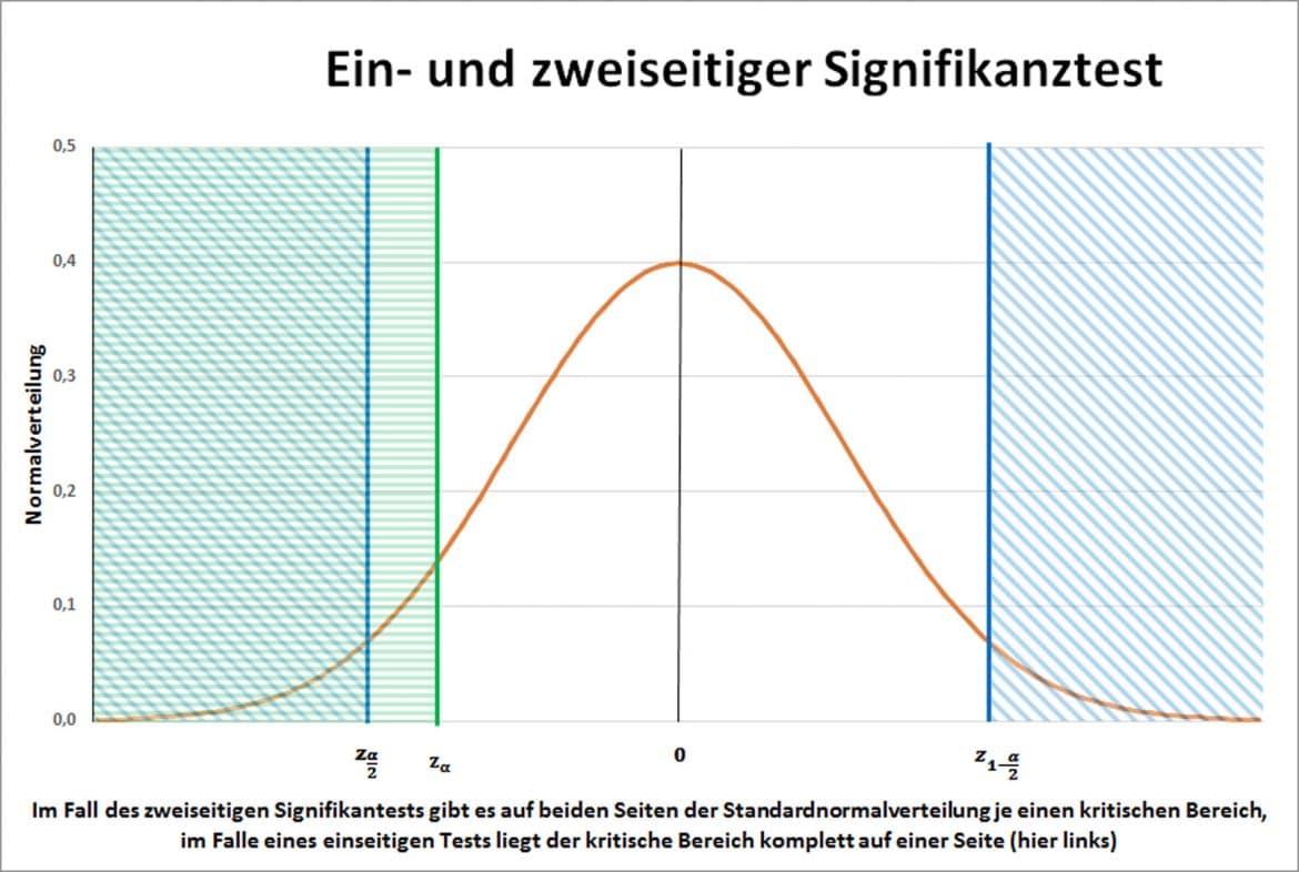 Dies können wir auch in der Dichtefunktion der Normalverteilung so einzeichnen (siehe folgende Abbildung): Die Fläche in der Mitte umfasst die Wahrscheinlichkeit, wo die Nullhypothese nicht verworfen werden kann. Die strichlierten Flächen sind jene Flächen wo die Nullhypothese verworfen werden kann. Hierbei gibt es einen einseitigen und einen zweiseitigen Test gegen die Nullhypothese bzw. zwei Typen der Alternativhypothese:
