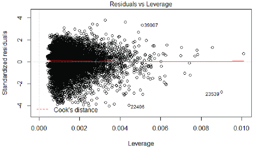 . Auch hier, wenn diese Annahme verletzt ist, können wir die Variablen transformieren (sqrt, log,…) - Keine Ausreißer: Wenn wir den Einfluss von Beobachtungen versus Fehlerterme darstellen, können wir Ausreißer identifizieren. Dies könnten wir versuchen auszuschließen.