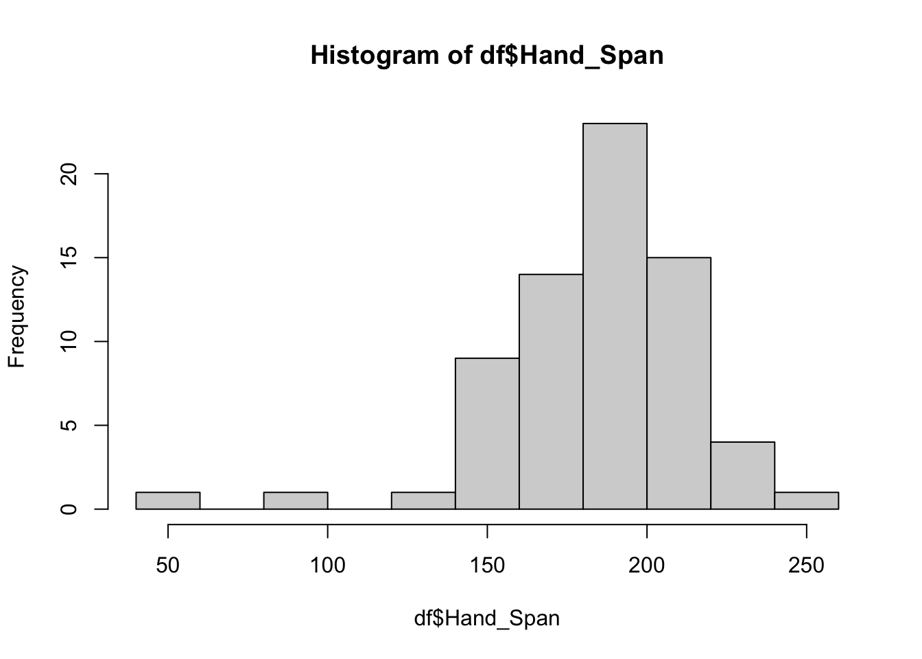hist(df$Hand_Span, main = "Hand span", xlab = "mm")
