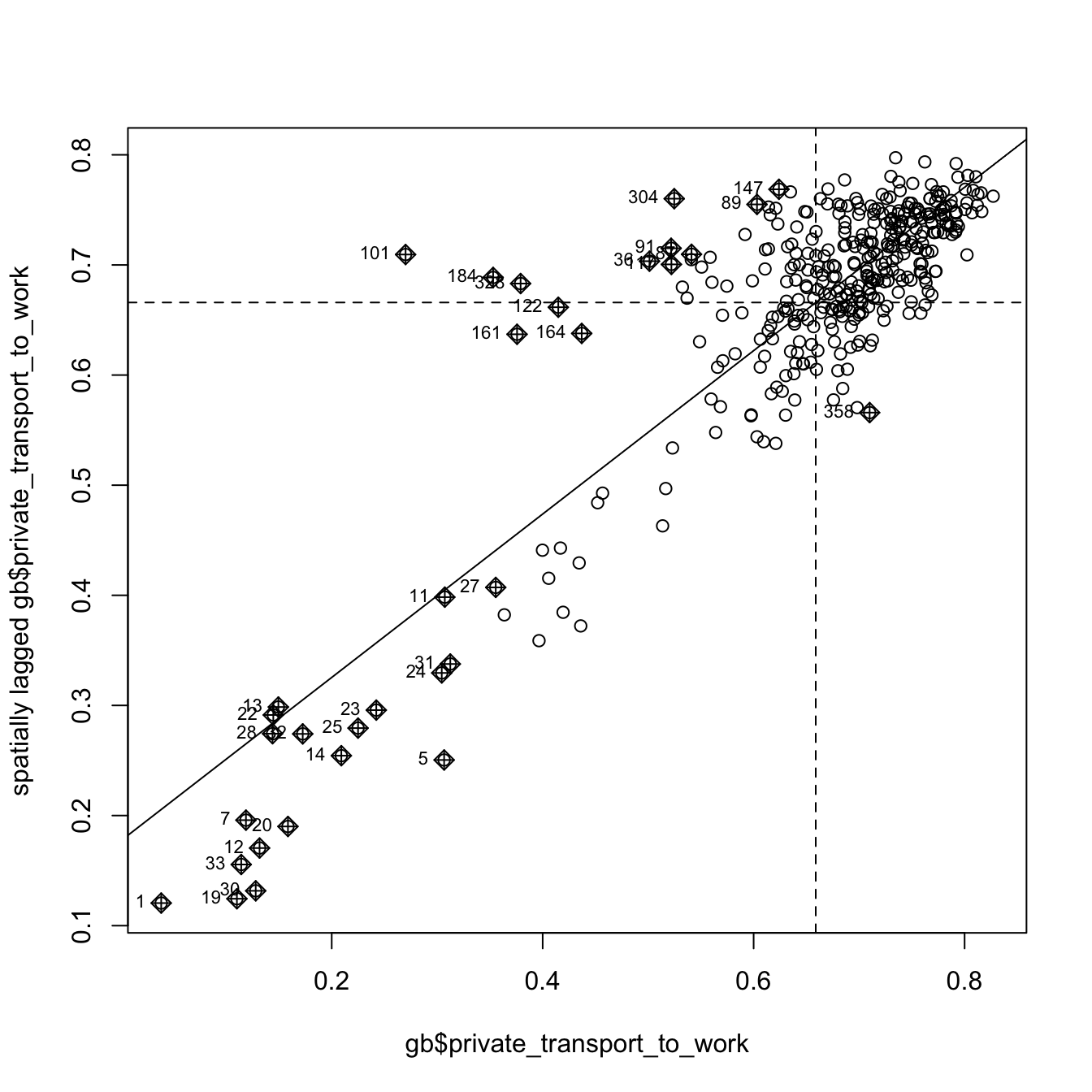 Task 1: Undertake a Moran’s I test and Moran plot of the private_transport_to_work variable. Comment on how it compares to the share_leave attributes.