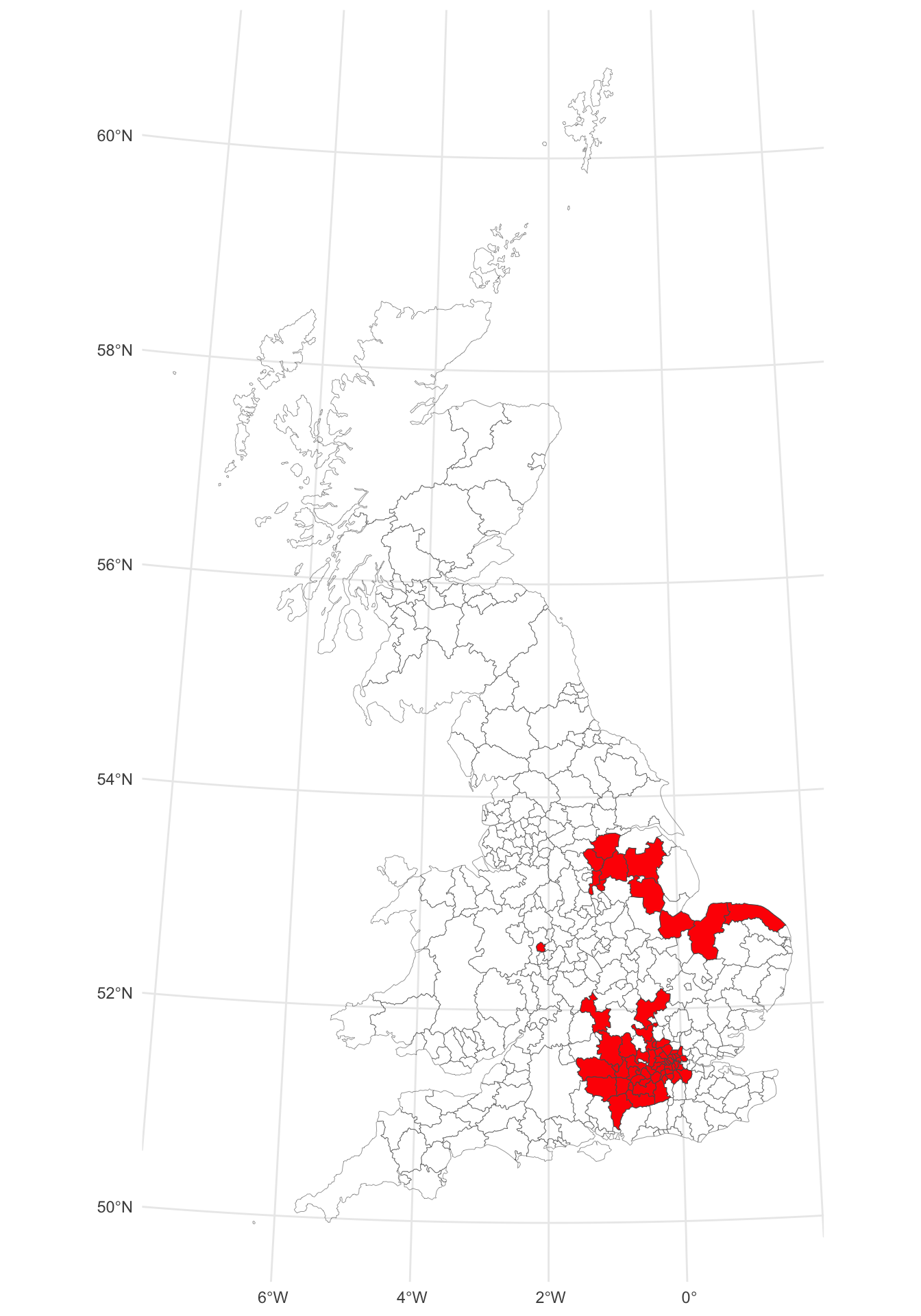 tmap_mode("plot")Now in order to complete the adjacency analysis, the list needs to be updated with links for island LADs. The table below shows the links and record numbers (IDs) of adjacent LADs:
