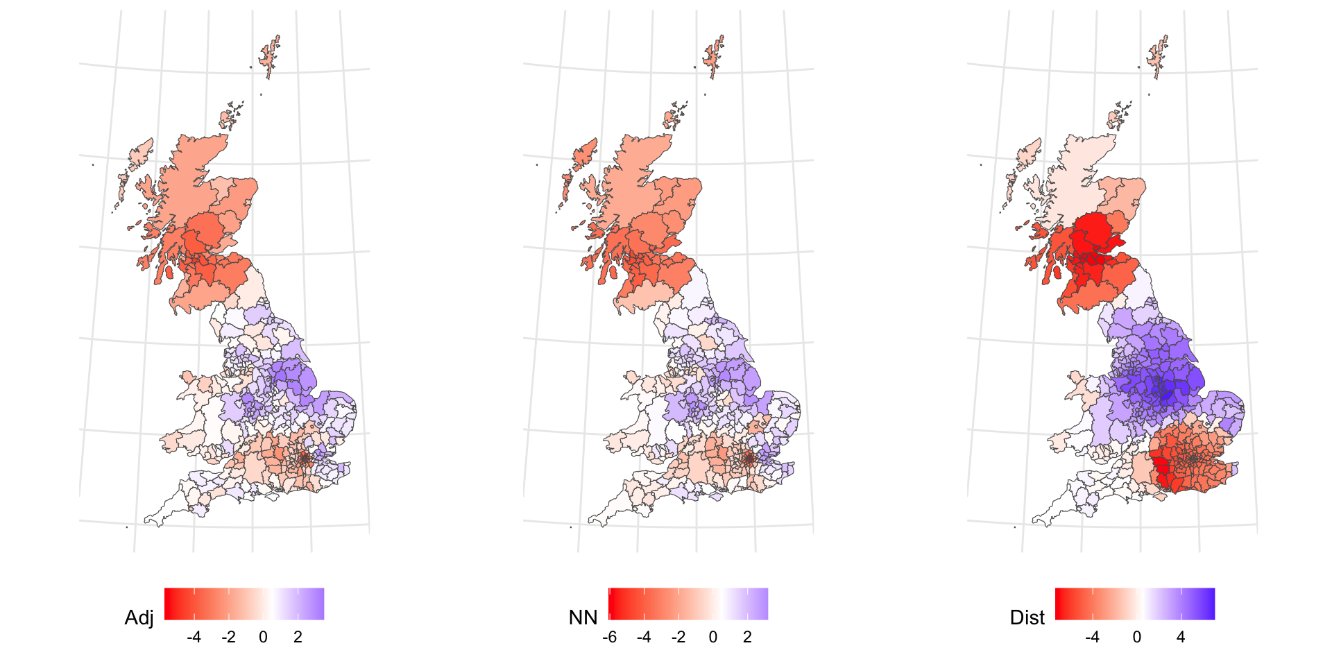 The impacts (benefits?) of incorporating a broader idea of Neighbourhood can be seen here: the key leave areas have a positive \(G\) (in blue) and the key remain areas a negative one in red. So the interpretation of the \(G\) is slightly different: