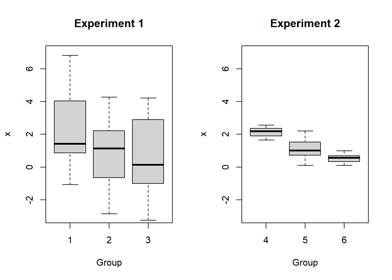 In fact, the means are \(\mu_1 = \mu_4 = 2\), \(\mu_2 = \mu_5 = 1\), and \(\mu_3 = \mu_6 = 0.5\). But the variances for the Experiment 1 groups are much larger than for the Experiment 2 groups! The larger variances in Experiment 1 obscure any differences between the group means. It is for this reason that we analyze variance as part of our test for differences in means.