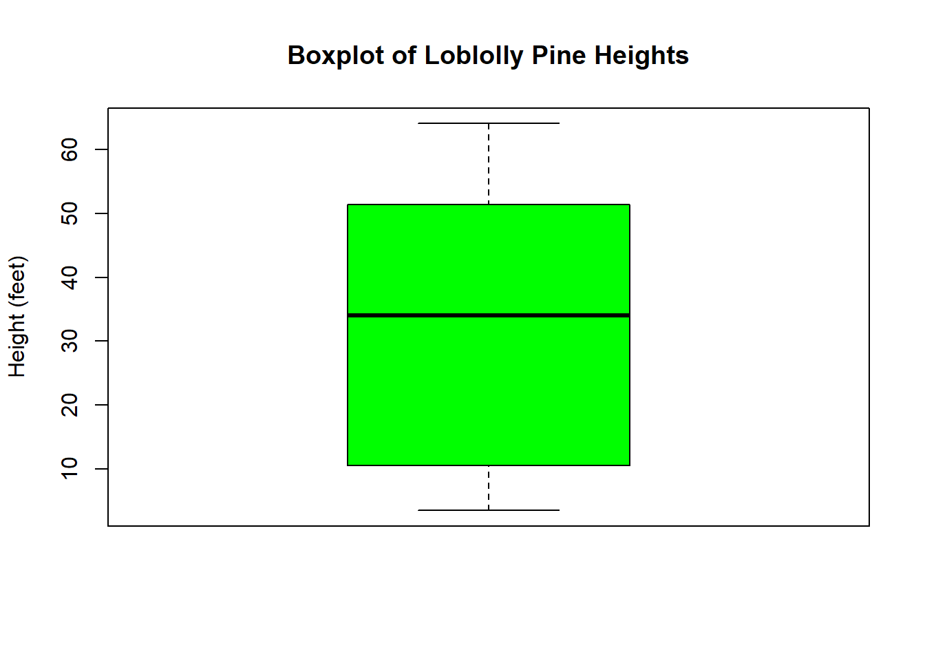 From R, we can see that the sample mean height of the Loblolly pines is 32.36 feet. (Note that R will often print things out with ## and a number in square brackets. This is just to help us keep track of things if we write a lot of lines of code. You can ignore that number in the brackets!)