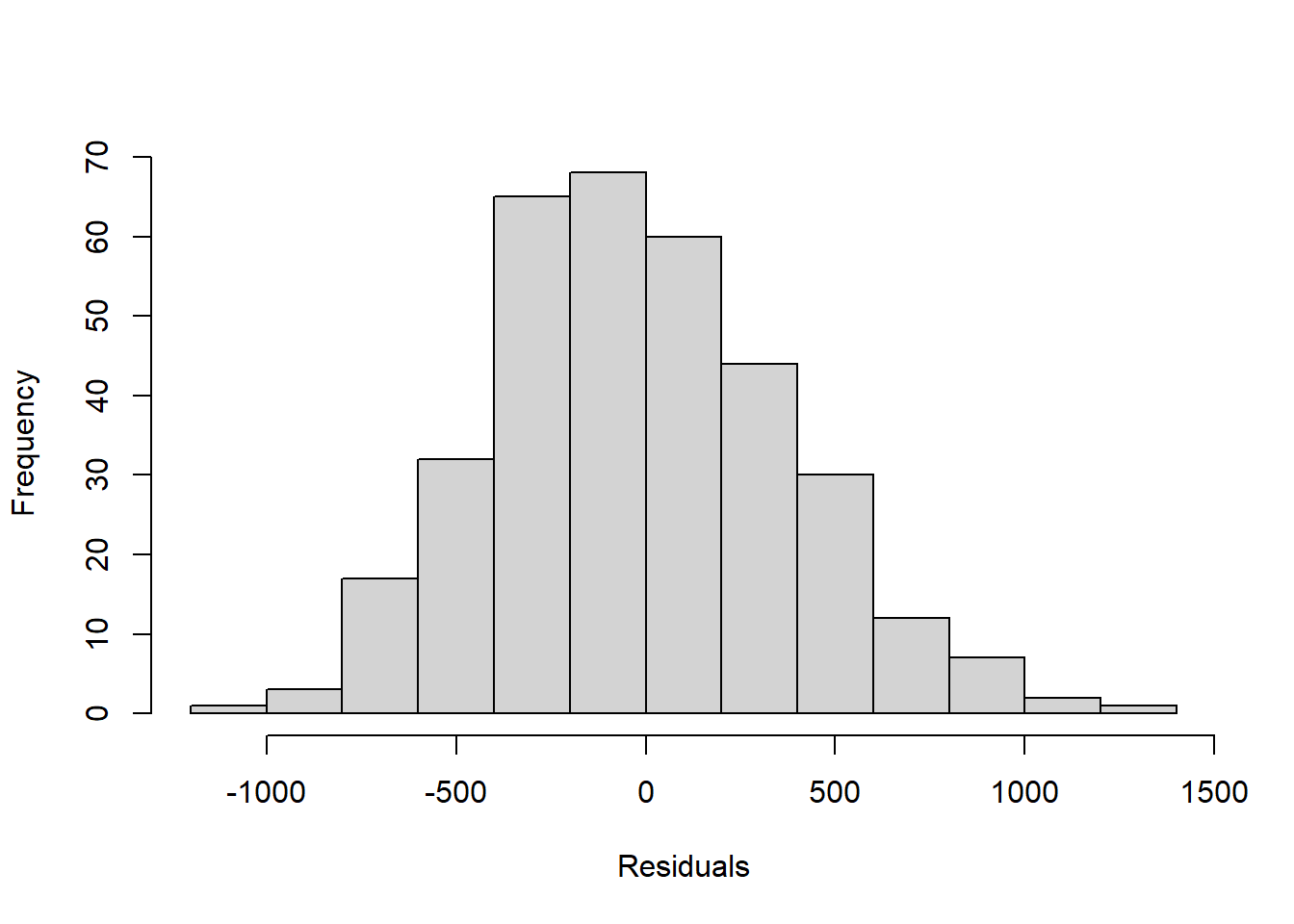 \[\hat{y}=-5780.83 + 49.69x\] We could examine the distribution of this model’s residuals using a histogram
