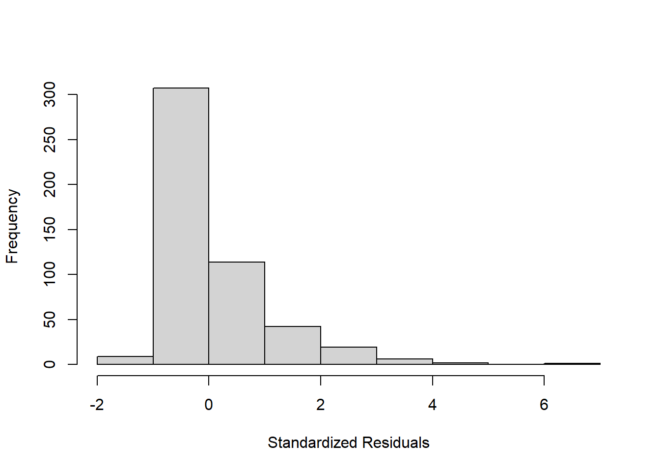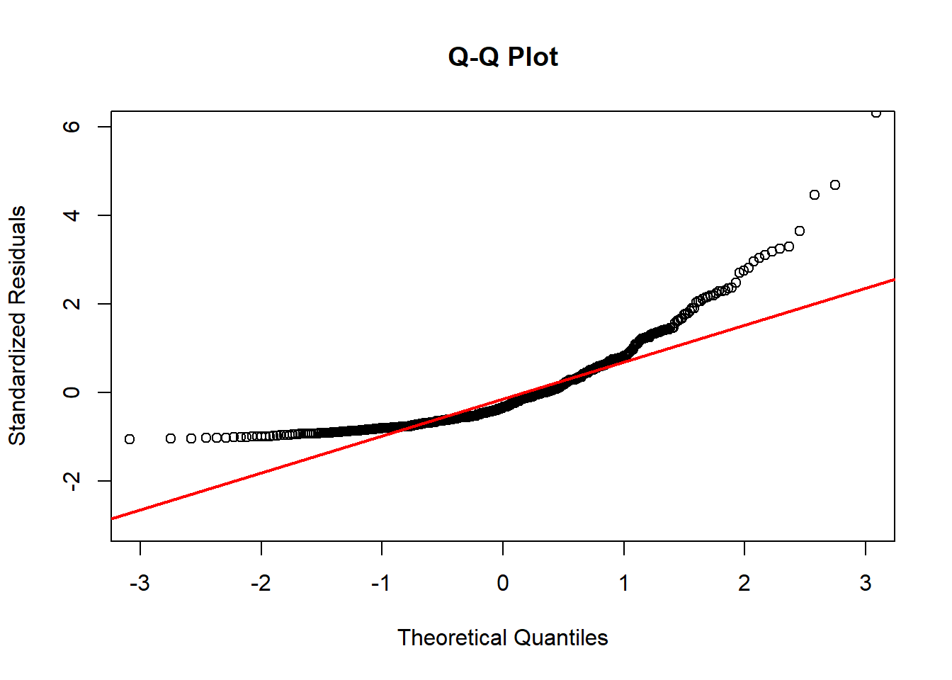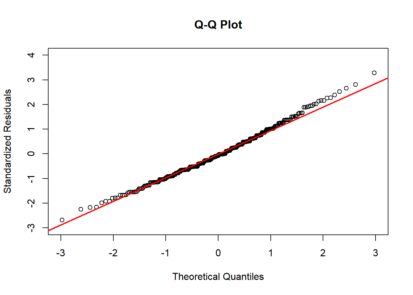 If the points fall along the line \(y = x\), then the standardized residuals match the quantiles of the standard normal distribution, which means they are normally distributed! Here, the line \(y=x\) has been added to the plot in red to make it easier to visually confirm normality.