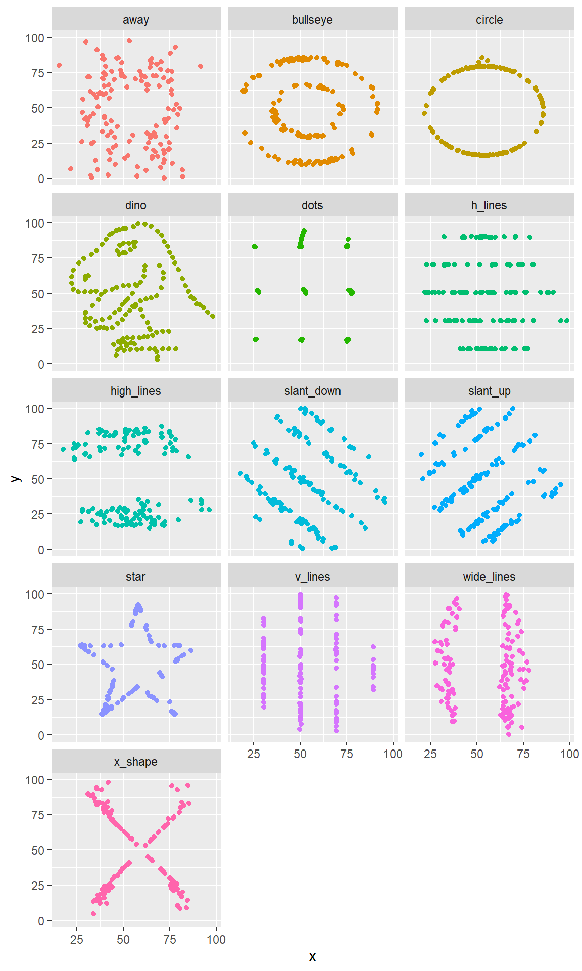 根据统计结果,我们可以发现,上面数据中各个dataset分类之间的x与y对应的均值和标准差都非常类似,那这是否意味着这些数据来自同一个群体呢?我们将各个dataset的数据画出来,可以得到下图。