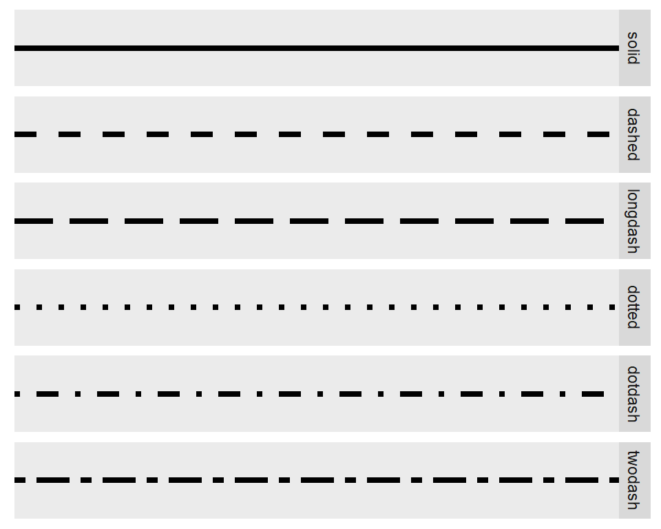 使用特定线的类型时,需声明linetype=线类型的名称或对应的序号。1对应”solid”,2对应”dashed”,依此类推。我们也可以设定线的类型根据变量的值而改变,此时需声明linetype=变量名称。