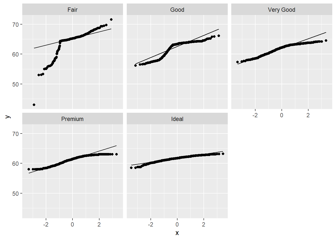 )## Warning in ks.test.default(x = diamonds$depth, y = "pnorm", mean = mean(diamonds$depth), :