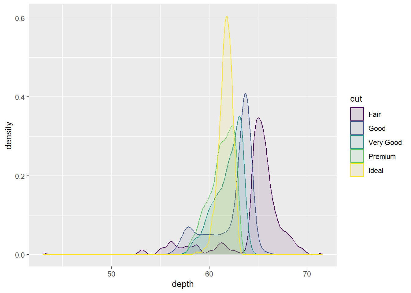 aes(depth, color=cut, fill=cut) # 按照不同的cut生成密度图