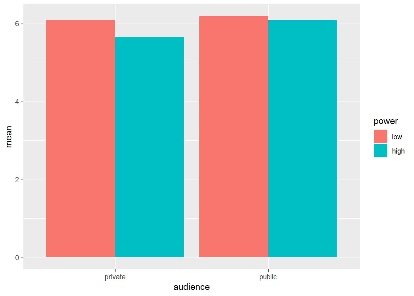 When carrying out a 2 x 2 experiment, we’re often hypothesizing an interaction. An interaction means that the effect of one independent variable is different depending on the levels of the other independent variable. In the previous section, the ANOVA told us that the interaction between power and audience was not significant. This means that the effect of high vs. low power was the same in the private and in the public condition and that the effect of public vs. private was the same in the high and in the low power condition. Normally, the analysis would stop with the non-significance of the interaction. However, we’re going to carry out the follow-up tests that one would do if the interaction were significant.