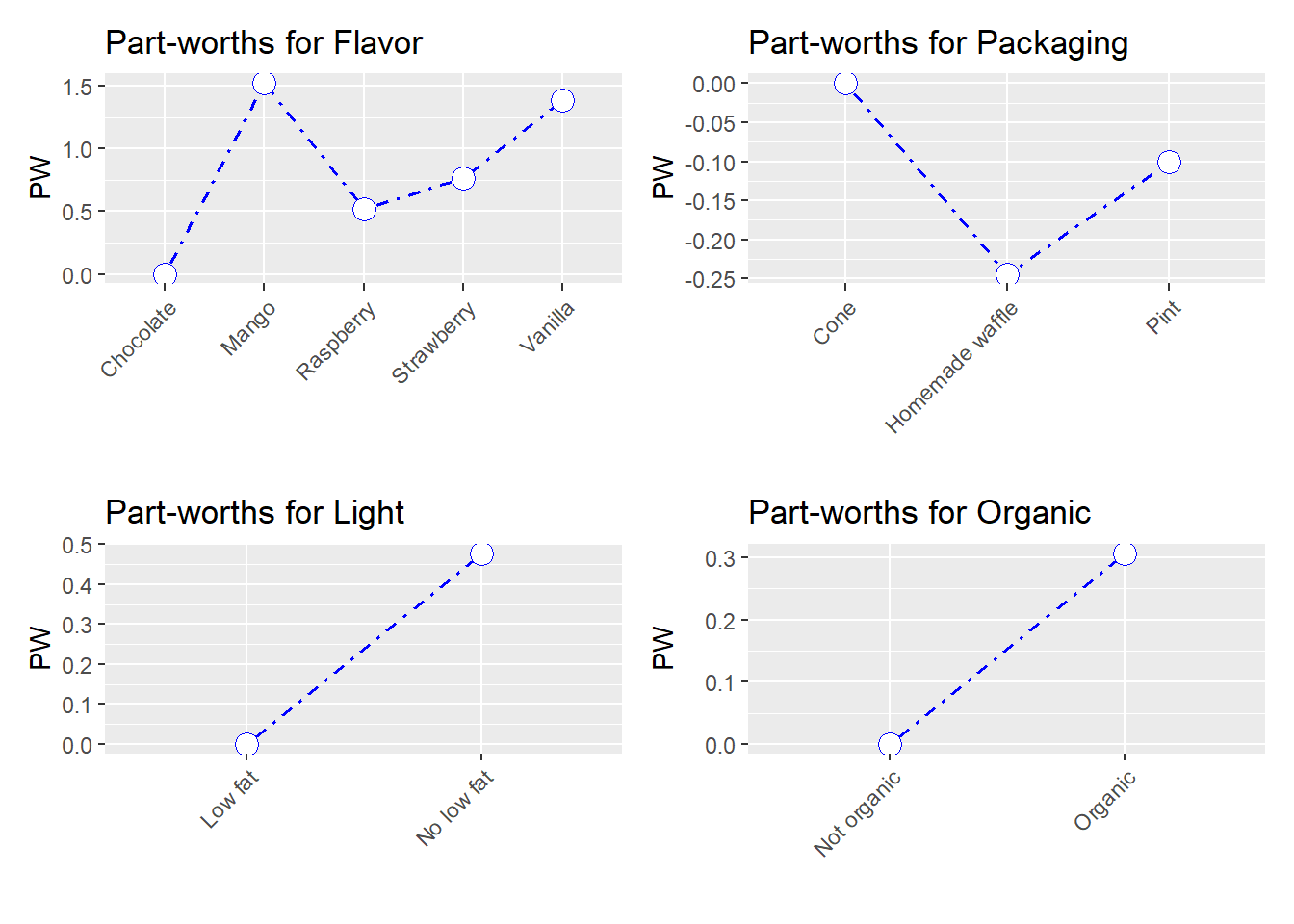 Now, let’s carry out the conjoint analysis on the full dataset to get an idea of which ice creams the 15 respondents, on average, liked the most and how important each attribute is: