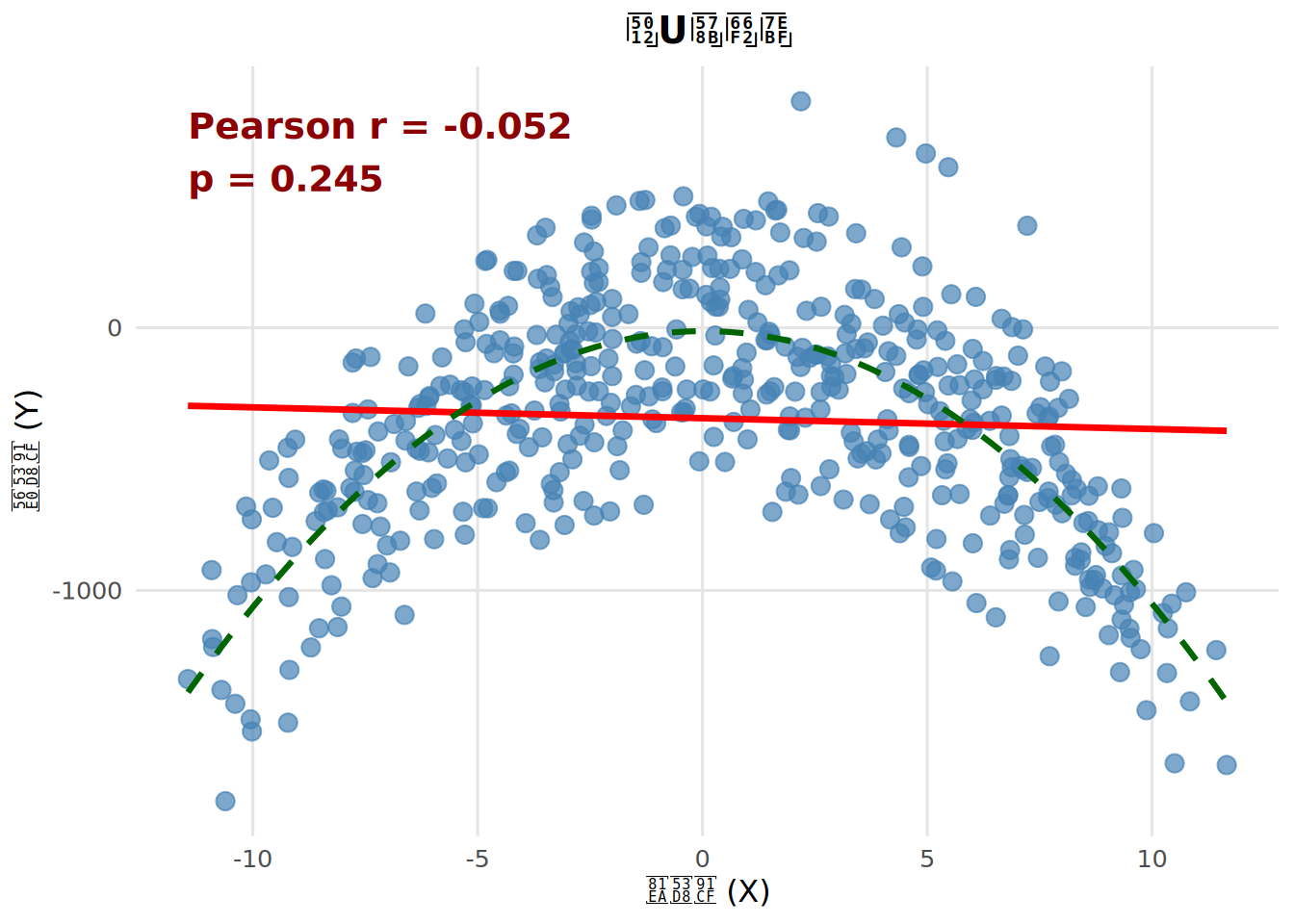 可以看到,图中的绿色虚线提示了两个变量间的关系其实是非线性的,实际上是一个倒U型曲线(想想心理学常说的关于动机和表现的耶基斯–多德森定律)。这条线一画,看上去就对数据的趋势有了一个贴切的描述。换句话说就是,皮尔逊相关系数并不能找到非线性,也就是不能用一条直线描述的相关关系(对非线性关系的检验我们会在 sec-nonlinear 中介绍)。所以,不管是点二项相关还是皮尔逊相关系数,反映的都是一种“线性”的相关关系。
