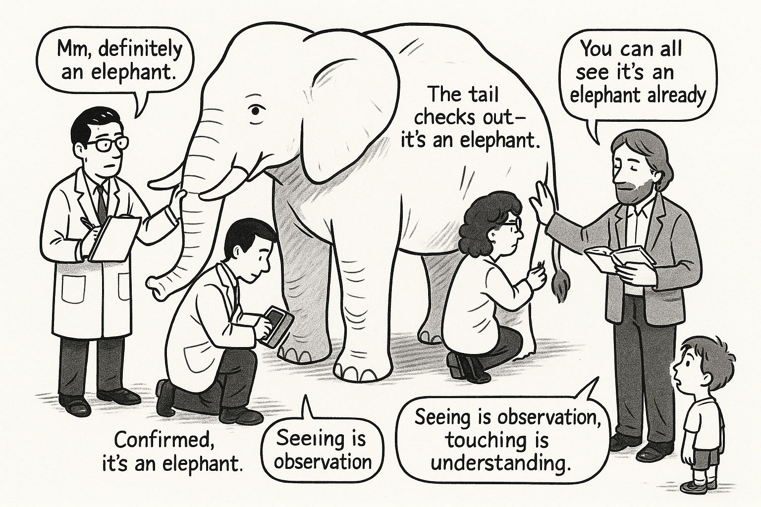 相信大家对盲人摸象的典故都不陌生。几个盲人接了个盲人按摩的活,给一头大象做马杀鸡1。每位盲人负责一个区域,有人摸腿,有人摸鼻子,有人摸肚子等等。最后活干完了,大家吵起来了,对自己摸的是啥产生了一些人民内部矛盾。