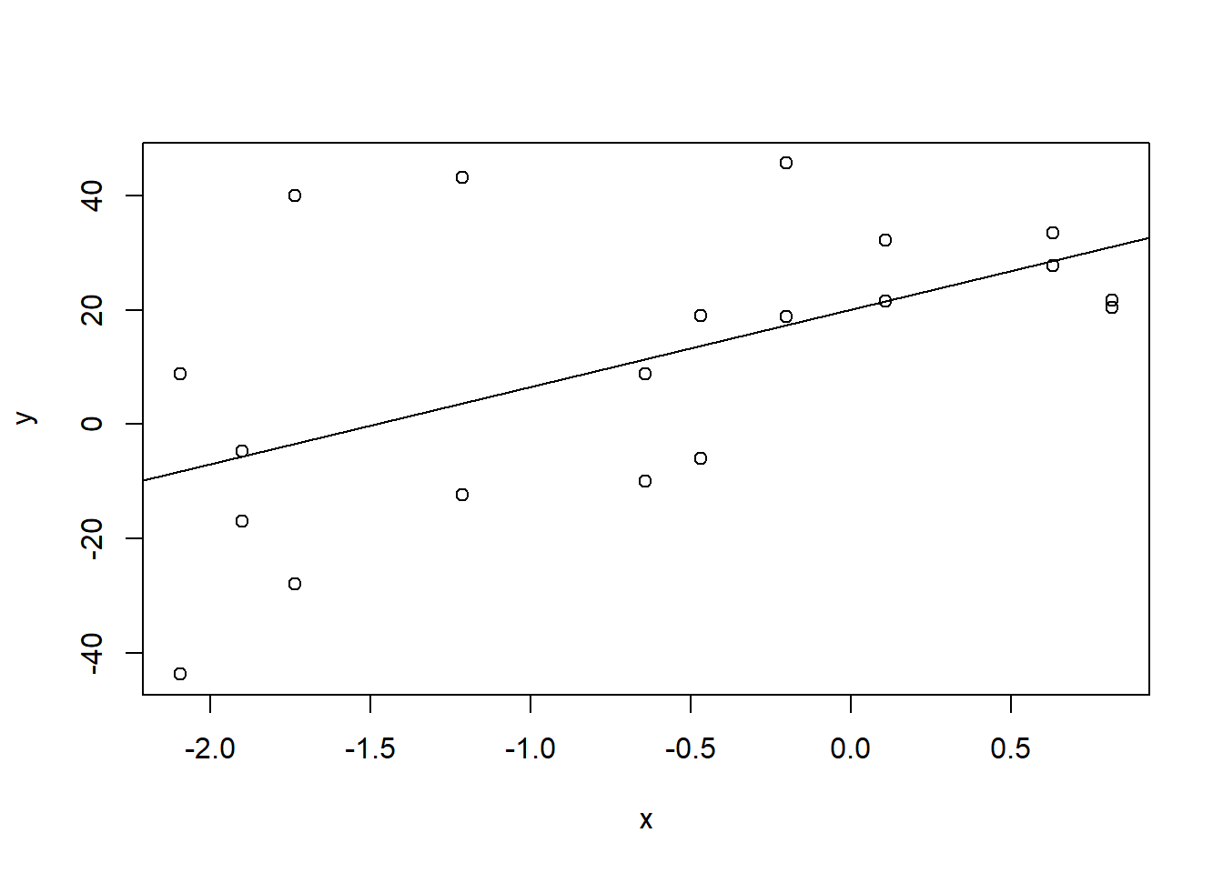 dummy.lm <- lm(y ~ x, data = dummy.df)下面的20.05为截距和13.55为斜率,都是拟合直线的参数。表示 \(\widehat y=20.05+13.55x\)。