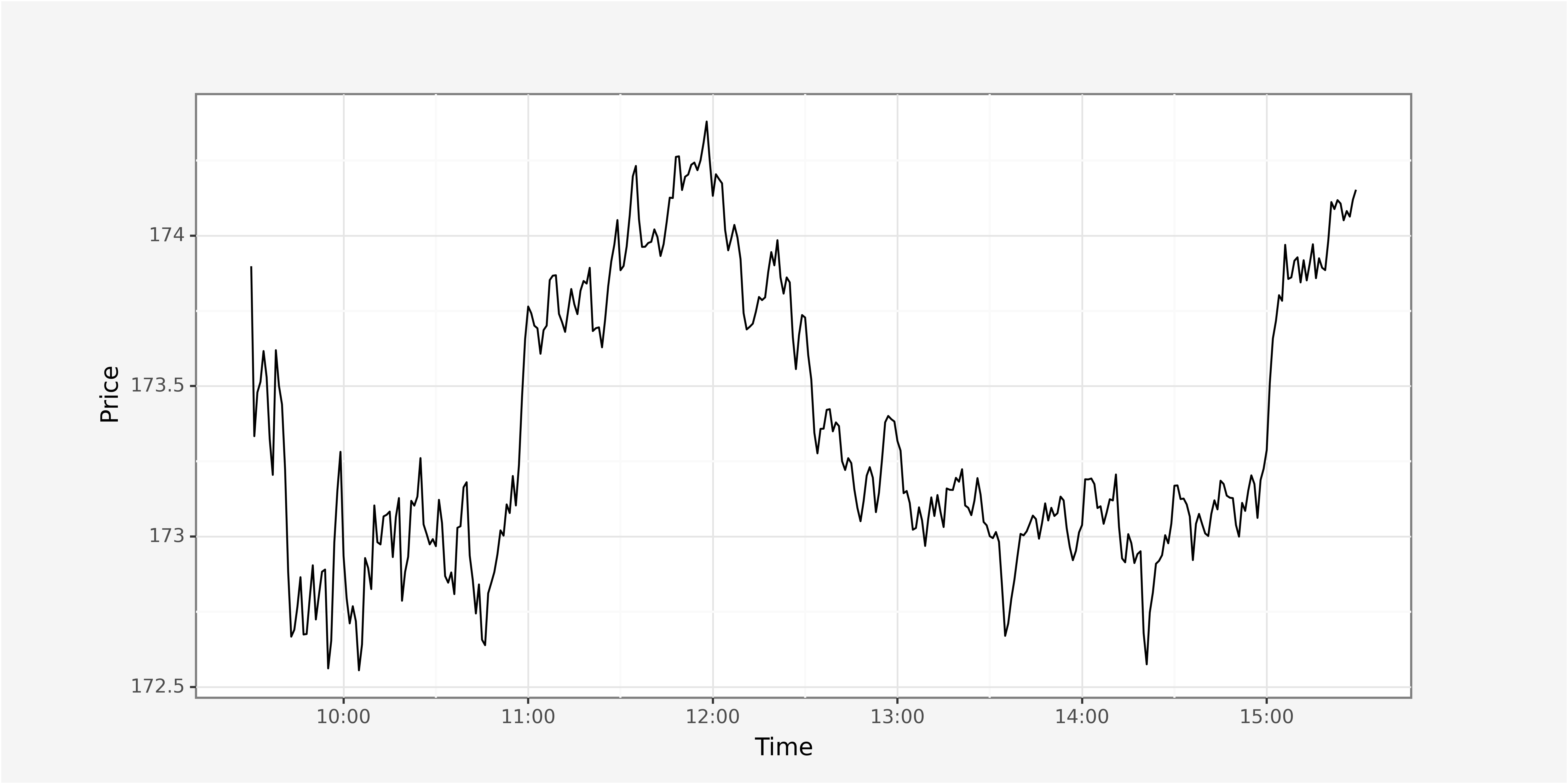 import numpy as npIn order to allow proper visualization of the data it is necessary to identify relevant metrics that require plotting plus a selection of the appropriate visual. We start by plotting trade price and volume throughout the day discretized on a 1-minute time interval for AAPL on the 2022-02-01.