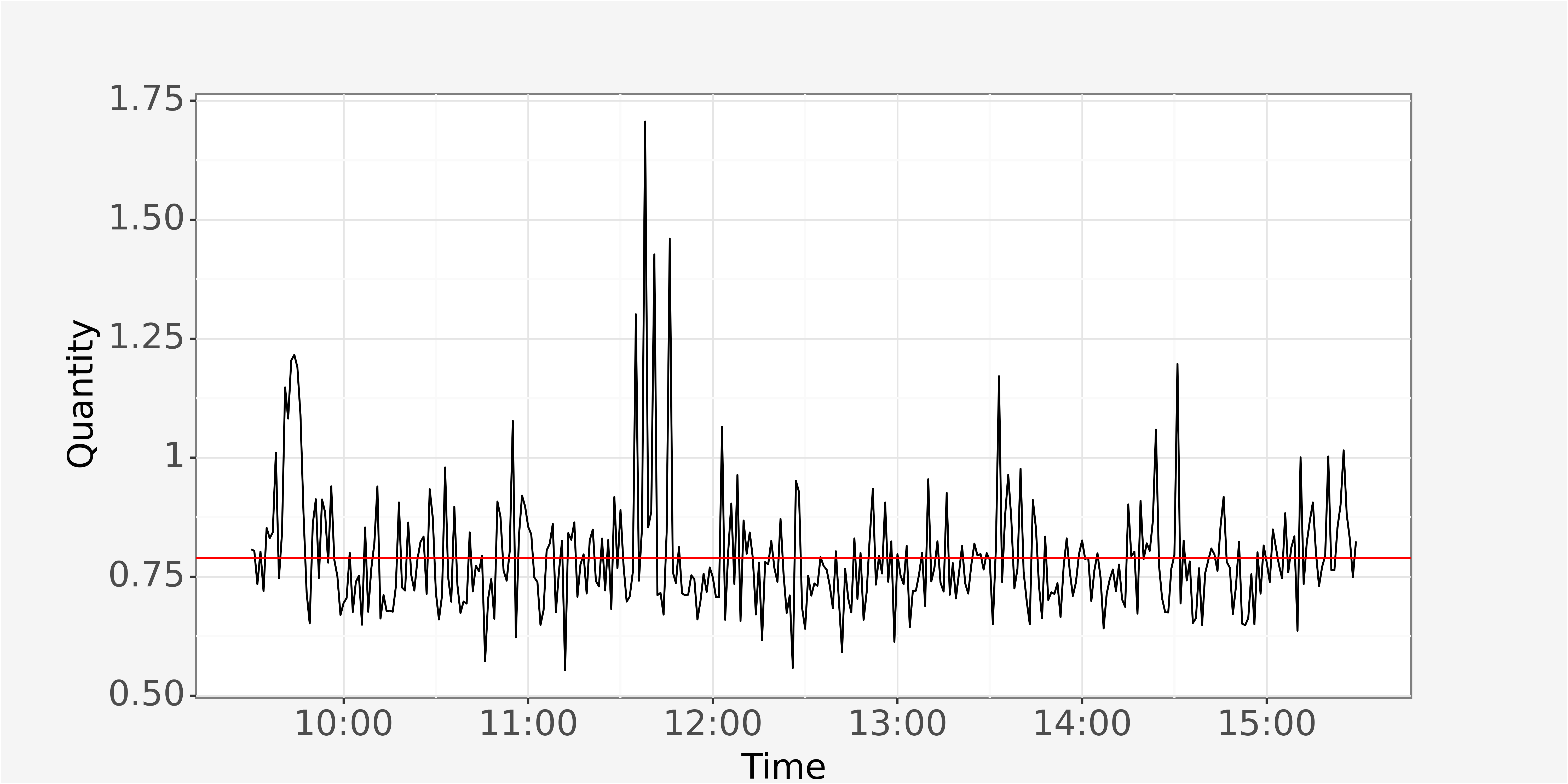 median_quantity = np.median(trades_lowfreq.quantity).round(4)Plotting the volume throughout the trading day yields the following graphic.