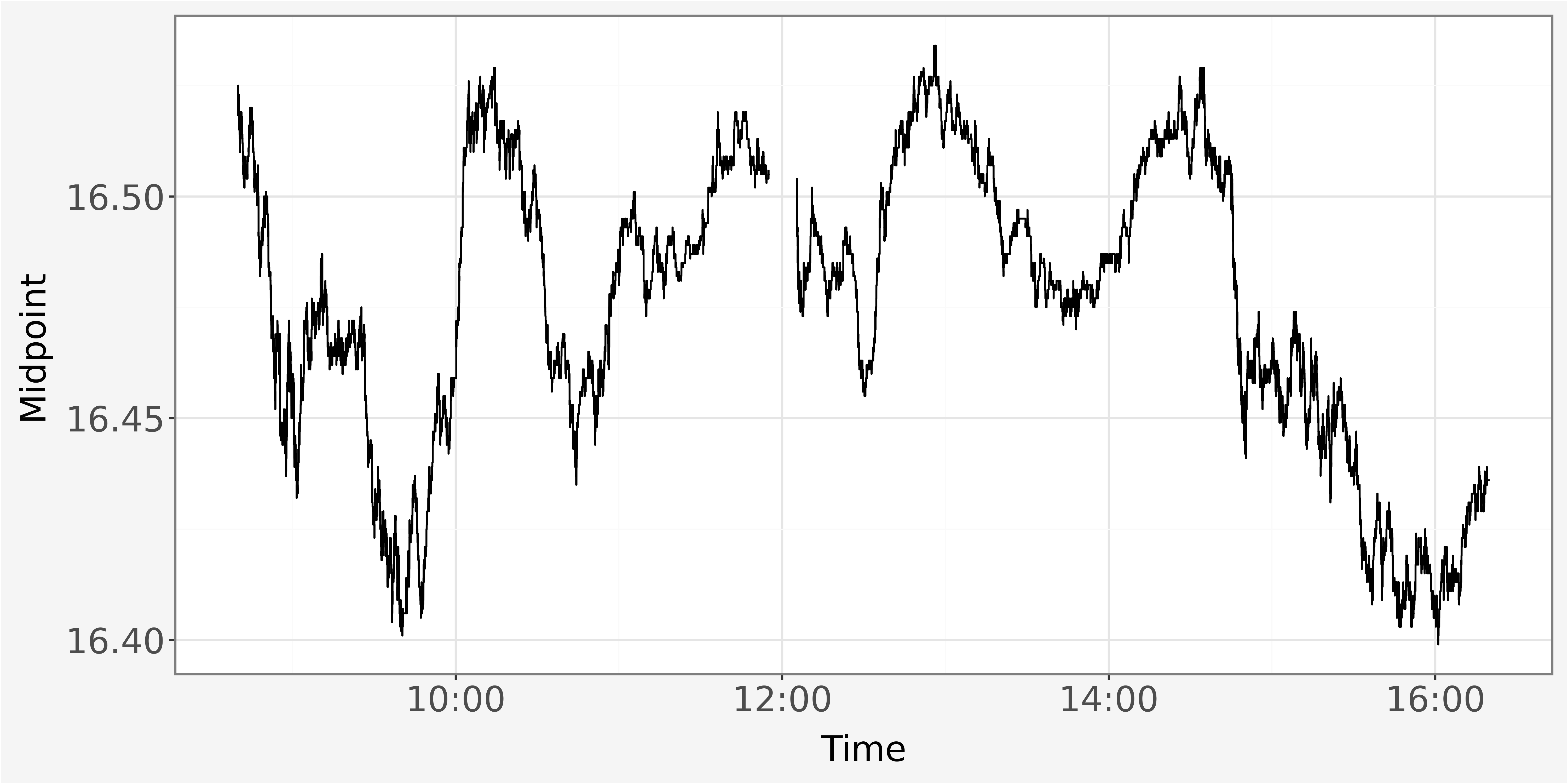 We plot the evolution of the best bid and best ask prices by investigating the shifts in the midpoint \(MID_t\) throughout the trading day to infer about an potential liquidity increase or decrease. The midpoint is calculated as average of best bid \(P_t^b\) and best ask \(P_t^a\) price: