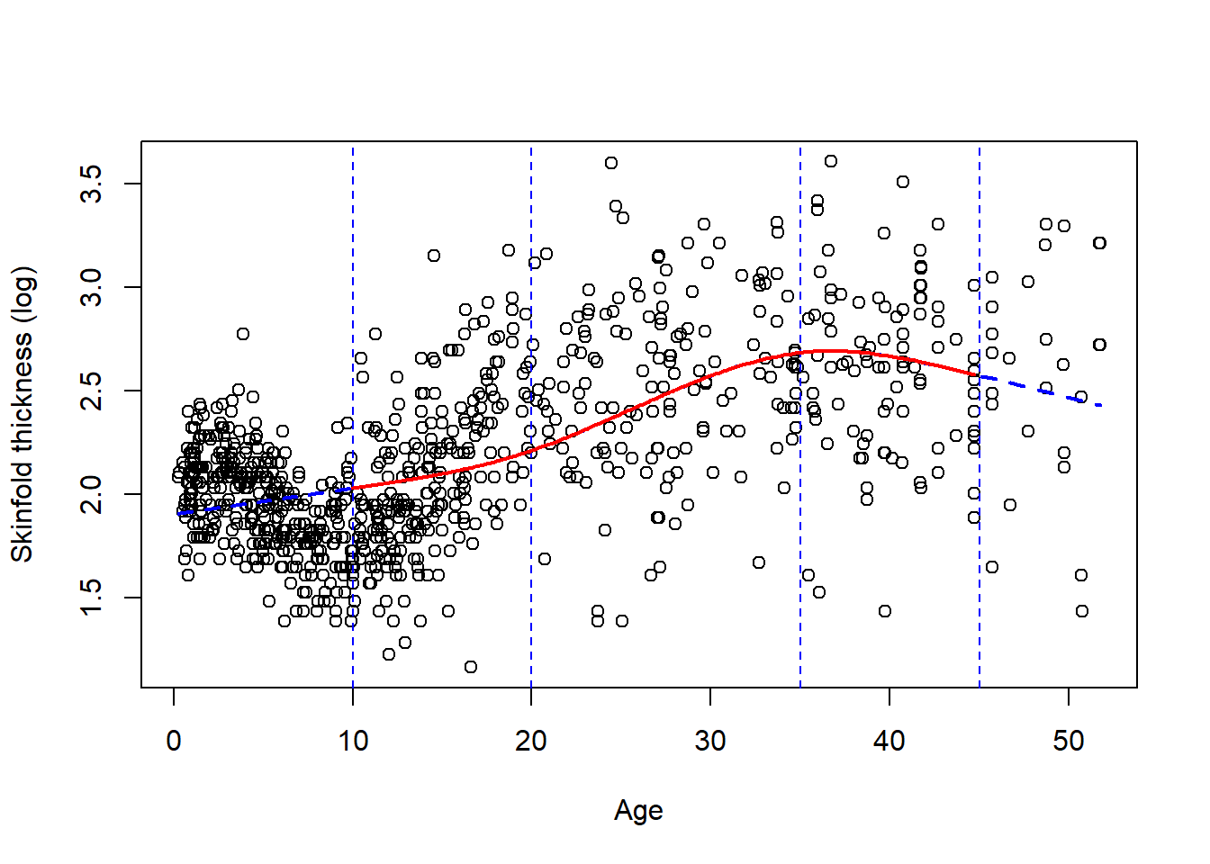 There are 4 terms because we choose 5 knots (i.e, d.f. = number of knots minus 1) noted \(S_1(age)=age\) in blue, \(S_2(age)\) in red, \(S_3(age)\) in magenta, \(S_4(age)\) in green on the left panel. Each individual spline function (called spline basis) should not be interpreted individually. What matters is their ``combined effect”, i.e the function \(f(age)=b_0 + b_1S_1(age)+b_2S_2(age)+b_3S_3(age)+b_4S_4(age)\) which is very smooth and seems to capture well the features of the data. Here the coefficients \(b_0,b_1,\dots,b_4\) where calculated by fitting \(f(a)\) to the data. Such a fit is possible using standard commands since the function linear in the coefficients despite its nonlinearity in age.
