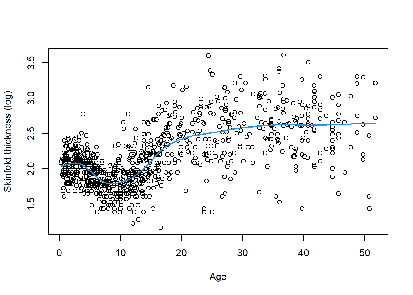 To motivate, we consider data on 892 females under 50 years collected in three villages in West Africa. Investigators are interested in exploring the relationship between age and triceps skinfold thickness, a crude measure of body fat. The dataset is called triceps and include age, thick and logthick, for respectively age in years, triceps skinfold thickness in mm and its logarithm. The figure below displays the the relationship between age and logthick and it is immediately clear that this relationship in nonlinear on such a wide age span. A nonparametric smoother (LOWESS) can be applied to the data and returns the blue fitted line confirming the visual impression.
