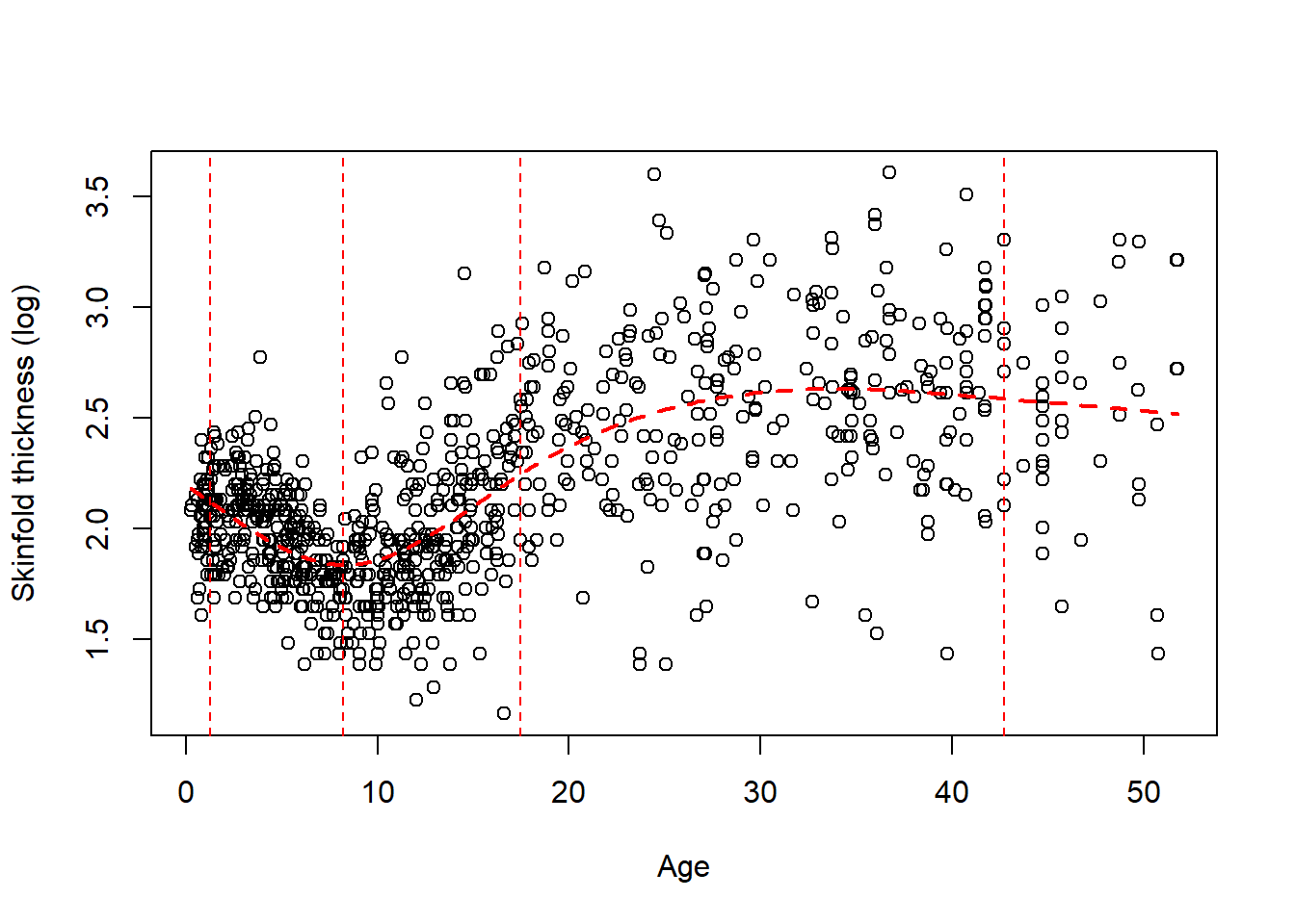 ## age'' -1.4045 0.0993 -14.14 <0.0001You may notice that the syntax is slightly different from the standard way to display an output after typing the lm command since summary() is not used. The display is rather unusual and indicates the coefficients for the various spline bases with the notation \(age^\prime\) and \(age^{\prime\prime}\) corresponding to two additional splines terms \(S_2(a)\) and \(S_3(a)\) that are never interpreted separately.
