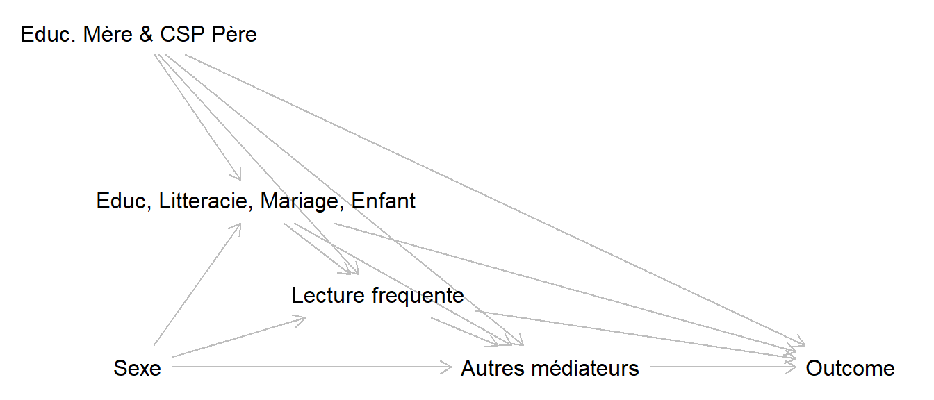 Par exemple, si l’on veut étudier la part médiée par le fait de faire du sport à 23 ans, on va intégrer les variables socio-économiques et relatives au réseau social comme des facteurs de confusion intermédiaire. La place des autres variables comportementales est plus discutable : le fait de boire ou de fumer peuvent être des marqueurs d’un certains mode de vie qui va favoriser ou non le fait de faire du sport, mais l’inverse est aussi vrai. Le lien est bidirectionnel, ce qui ne peut pas être étudier ici.
