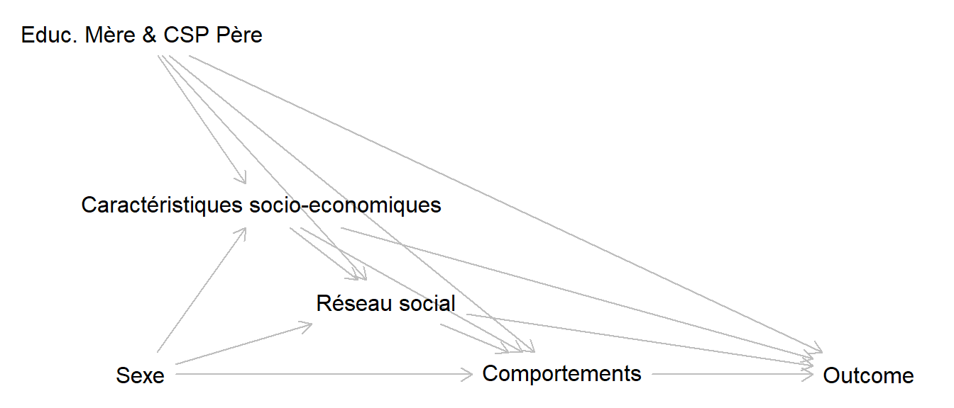 - mesurer la part médiée par les comportements, les variables relatives aux comportements et aux caractéristiques socio-économiques doivent être inclues comme facteurs de confusion intermédiaires.