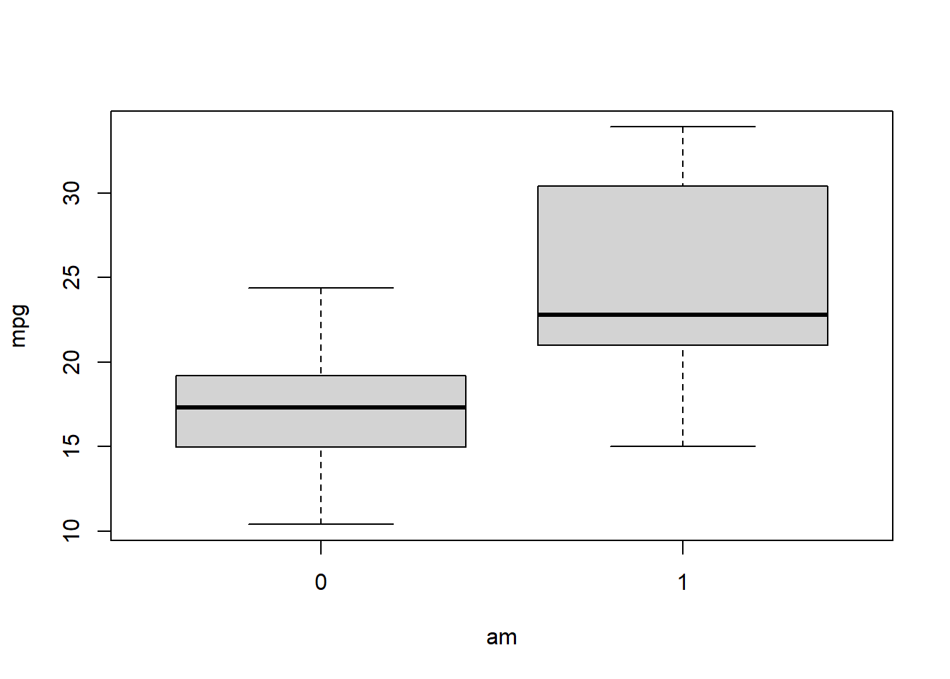 Use the boxplot() command to plot mpg by am. See Practice 06: Box plots in R. Note that am is equal to 0 for automatic transmission and 1 for manual transmission.
