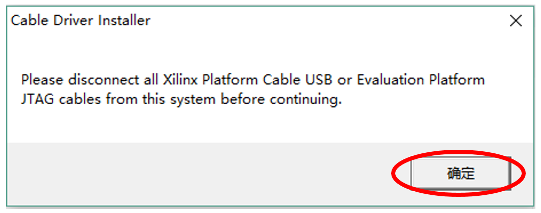 安装过程中如果提示断开所有Xilinx电缆的连接。确认断开并点击“确定”。
