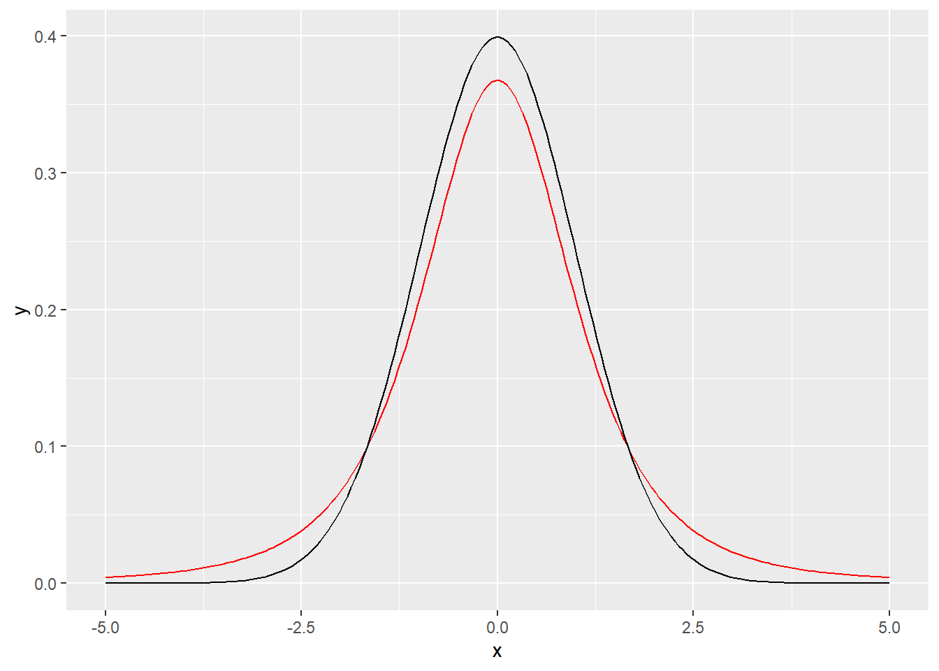 Here the \(t\) distribution is drawn in red (or gray depending on your settings), and the standard Normal is drawn in black for comparison. Notice how the \(t\) distribution has what’s called heavier tails – there’s more probability of getting values far from 0.