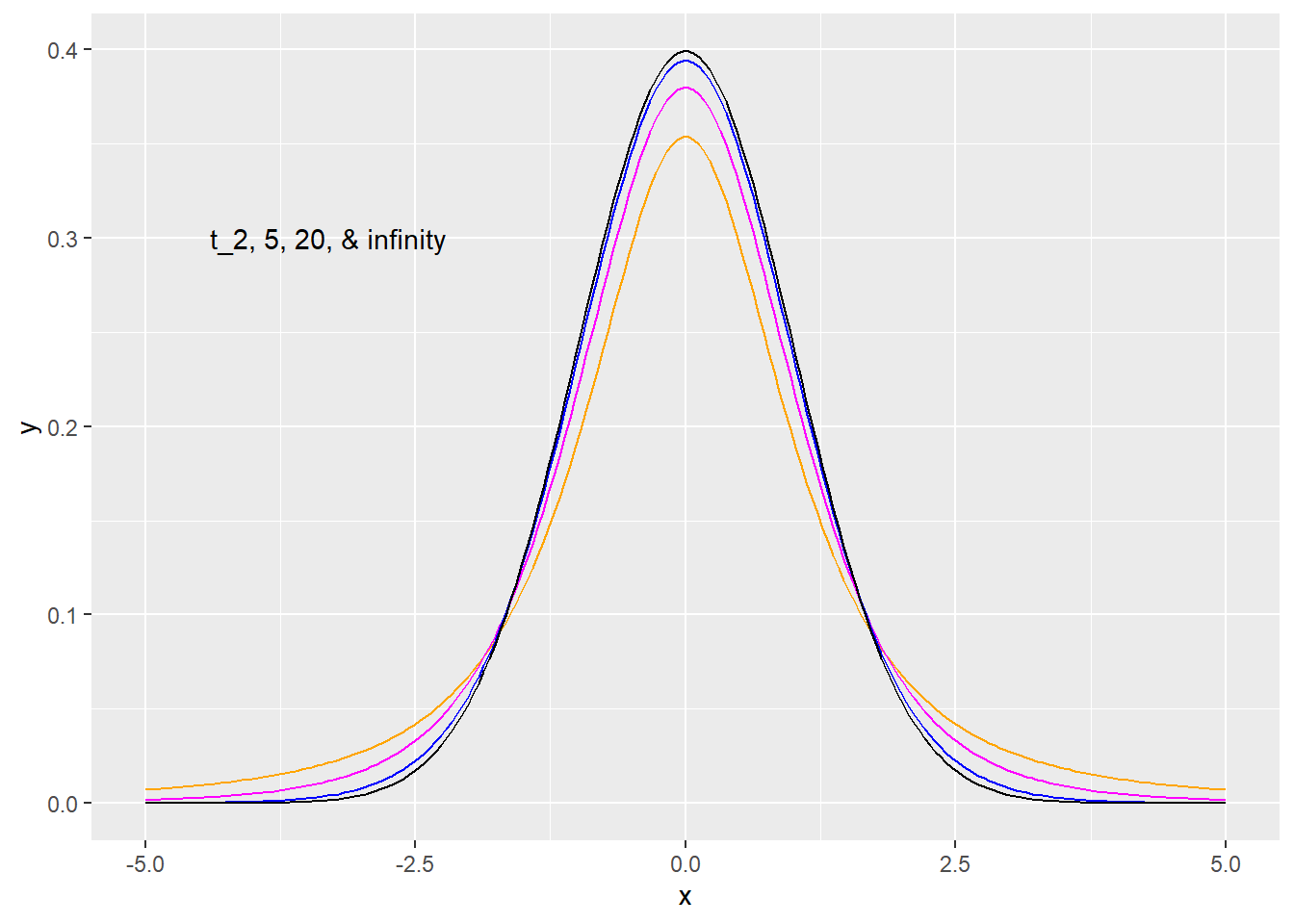 Here are the \(t\) distributions with 2, 5, and 20 df, plus the Normal: