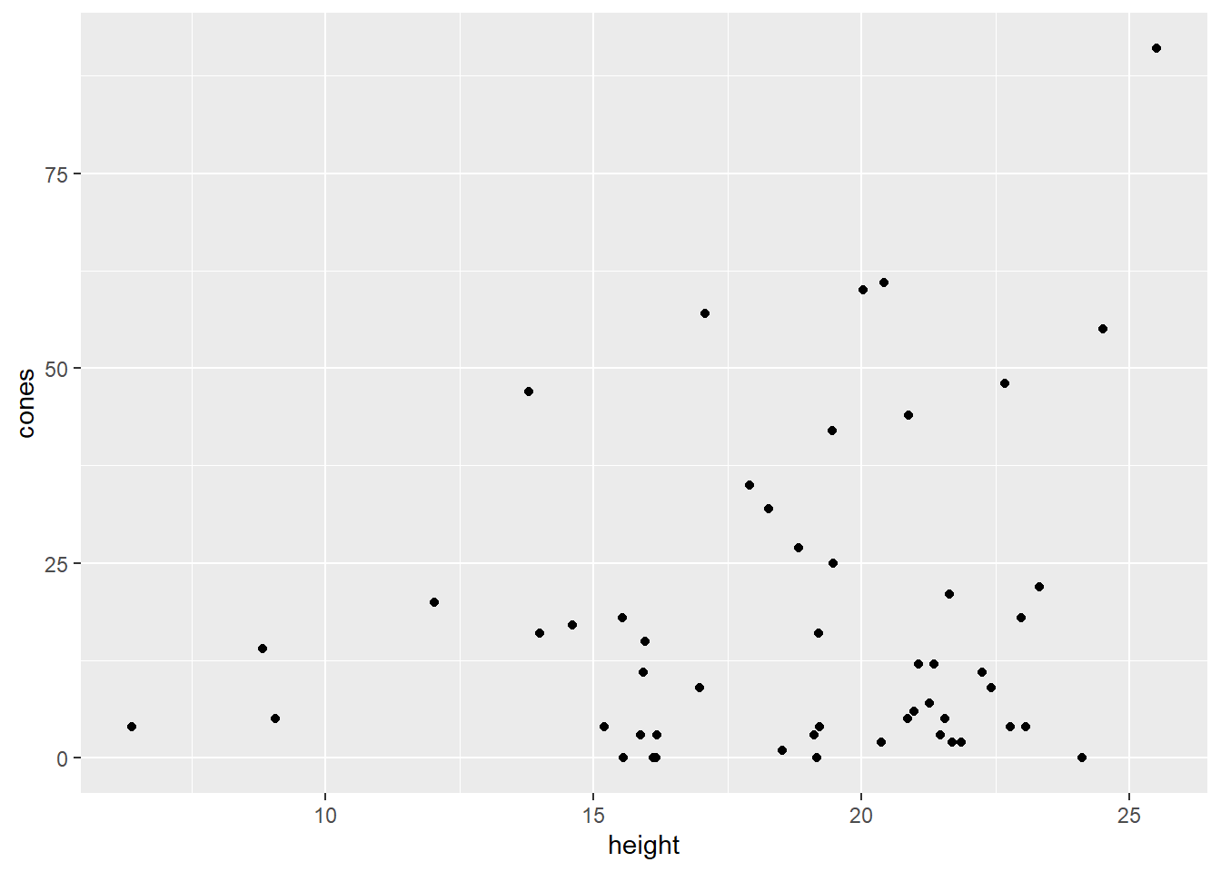 squirrel_dat = nutsLet’s look at a plot with cones, our response, on the \(y\) axis, using the average height of the trees on the \(x\) axis: