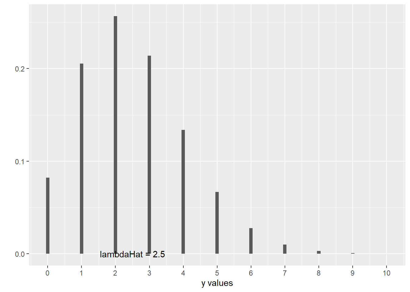 annotate(geom = 'text', x = 2.5, y = -.0, label = "lambdaHat = 2.5") +