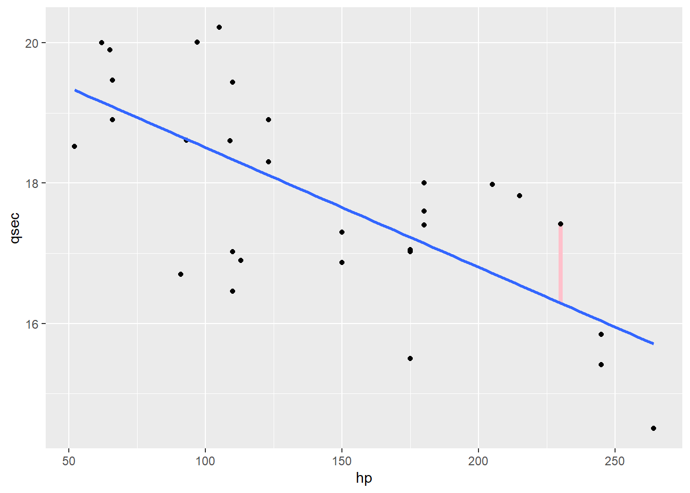 You may recognize these “distances” as the residuals for each point: the true \(y\) value minus the fitted \(y\) value, \(qsec - \widehat{qsec}\). We’d like to find the line that minimizes these distances overall.