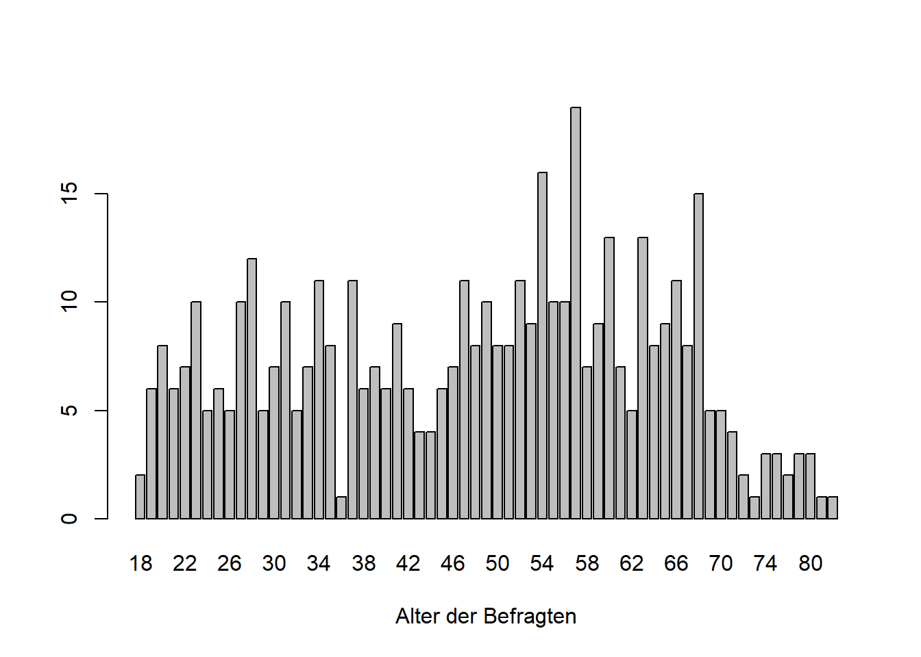 barplot(alter_auszaehlung, xlab="Alter der Befragten")