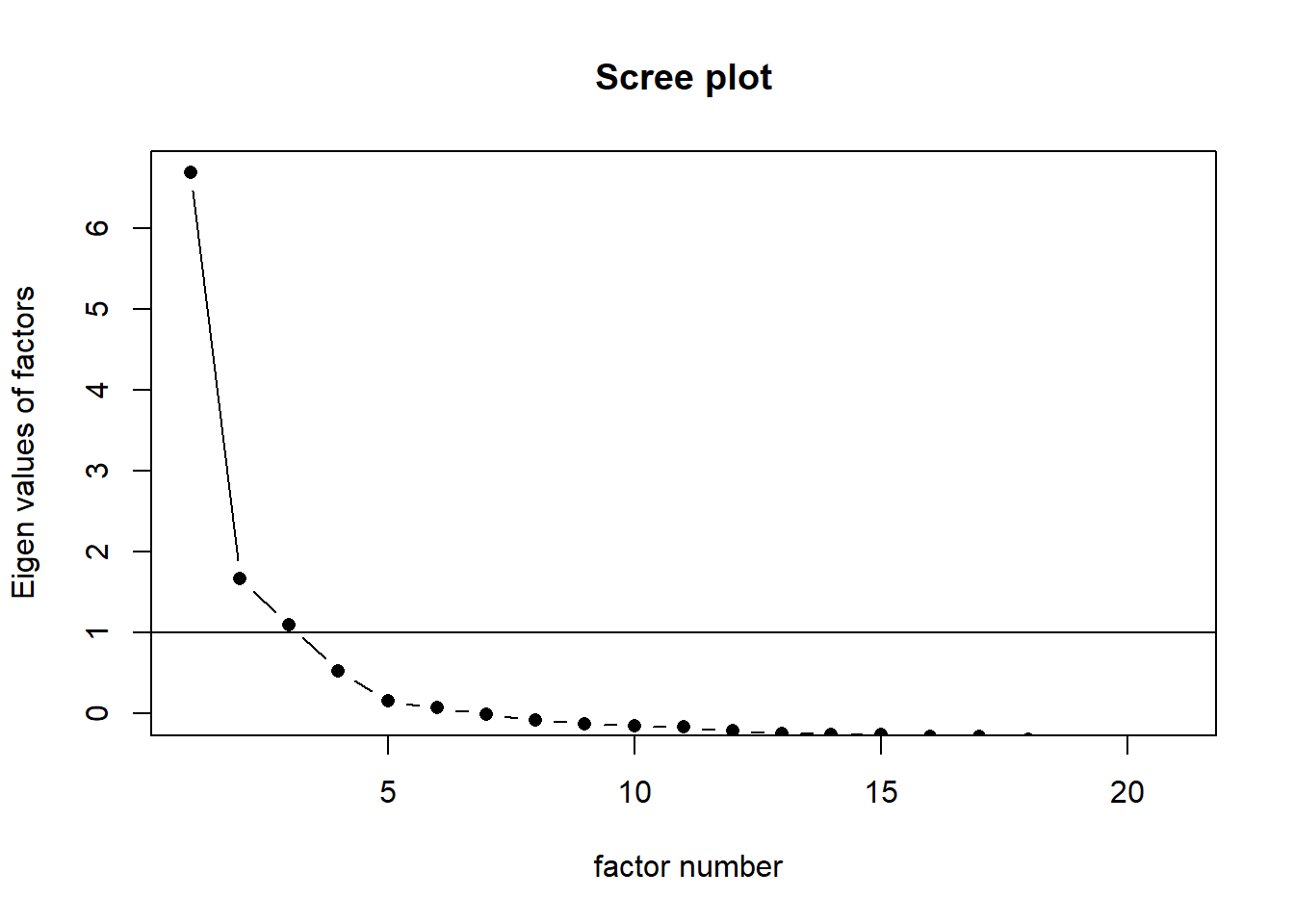 In the code below, we extract the number of factors and the look out for eigenvalues greater than 1.0. This represents the number of factors to retain. The result suggests that the first four factors explained a variance of 7.342, 2.390, 1.771 and 1.139. That is, there are potentially four factors extracted.