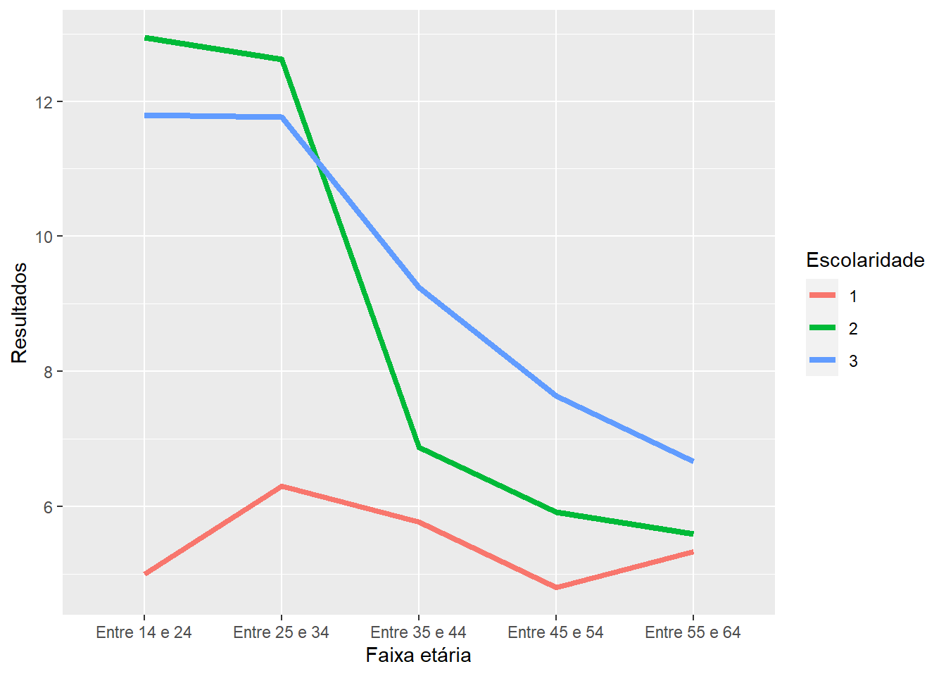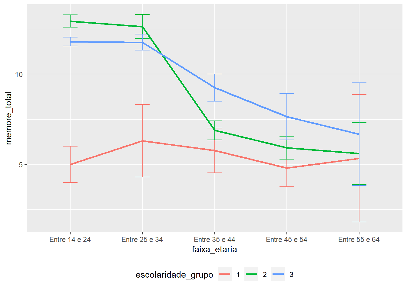 O gráfico parece indicar que a performance no teste varia tanto em função da idade, como em função da escolaridade do participante. Por exemplo, pessoas entre 14 e 24 anos, bem como entre 25 e 34 anos com ensino médio apresentam o desempenho mais elevado quando comparadas com os outros participantes. No entanto, isso começa a se alterar aos 35 anos. Para estes participantes e aqueles mais velhos, o ensino superior parece ser o principal determinante.