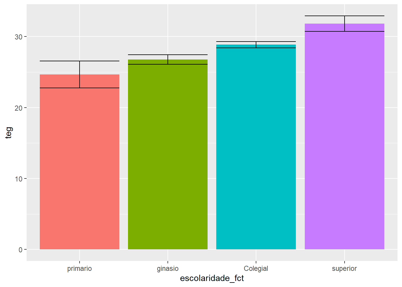 Tal como ilustrado no decorrer dos outros capítulos, gráficos são fundamentais para entendimento do relacionamento entre as variáveis. Uma vez que a escolaridade (VI) é tratada como discreta e a TEG (VD) é contínua, um gráfico de barras é adequado. A inclusão das barras de erro permite uma compreensão inferencial inicial.